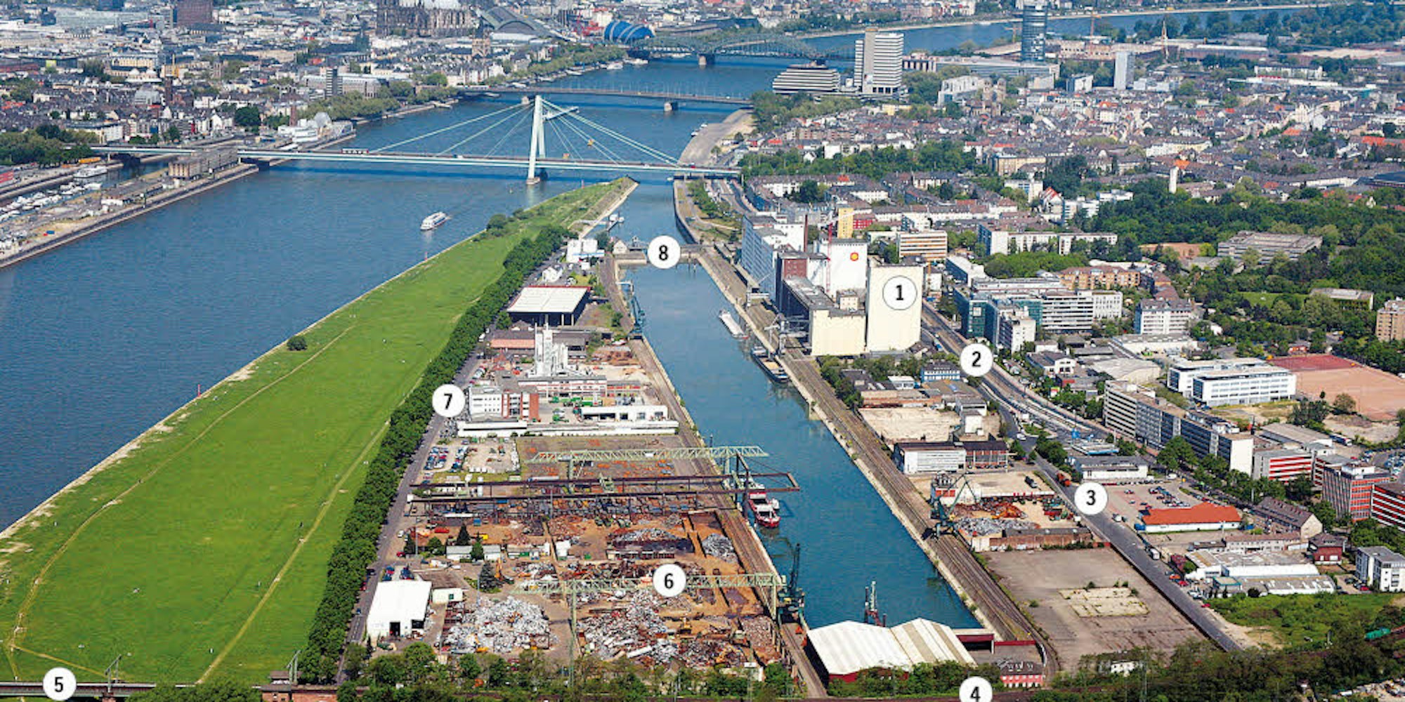 Der Industriehafen in Deutz: Die Ellmühle (1) will ihre Produktion verlagern. Begrenzt wird das Areal durch (2) Siegburger Straße, (3) Poller Kirchweg, (4) Eisenbahntrasse, (5) Südbrücke, (6) Schrottplatz, (7) Alfred-Schütte-Allee, und (8) Drehbrücke.