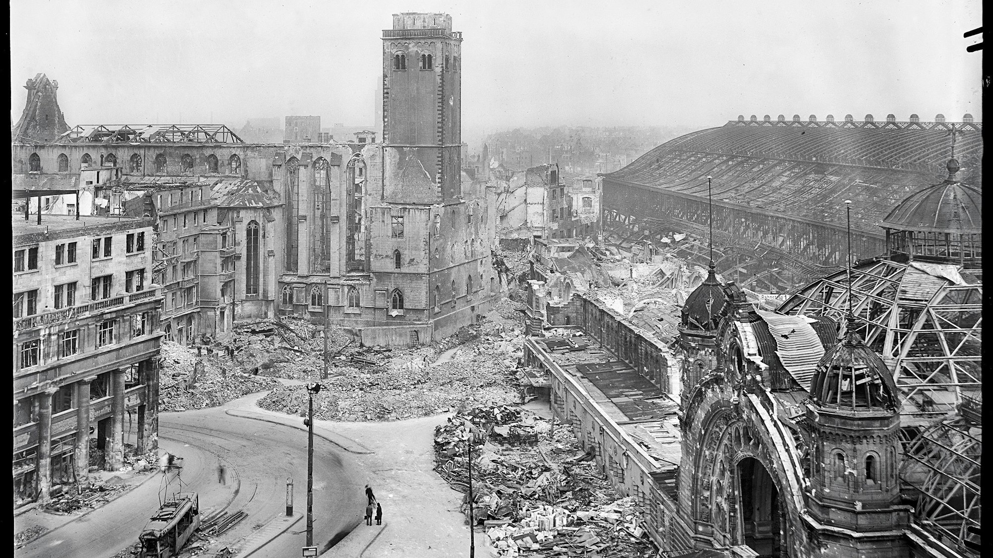 Blick aus dem Kölner Dom auf den zerstörten Hauptbahnhof