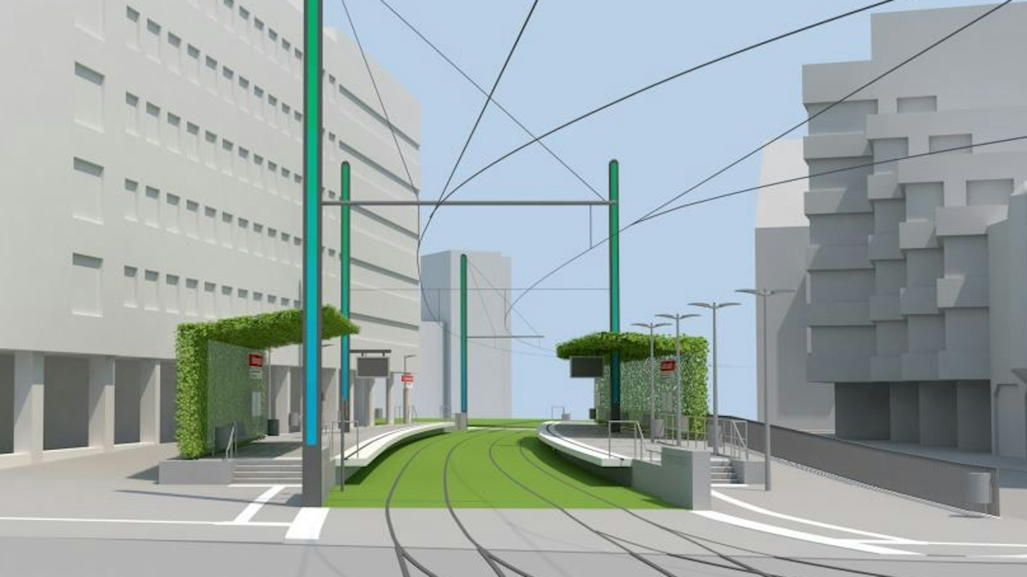 Im Spätsommer 2023 wurde diese Theorie über den Haufen geworfen. Der Verkehrsausschuss beschloss den Umbau der Haltestelle – und das in einem bisher nicht gekannten Ausmaß. Die Fahrgäste sollen künftig unter zwei begrünten Pergolen Aufstellung nehmen können. Der Grünbewuchs selbst werde Vögeln und Insekten Heimat bieten. Abgerundet wird das Erscheinungsbild durch ein Rasengleis. Damit das Grün in den heißen Sommertagen nicht vertrocknet, ist unter der Haltestelle ein Regenwasserspeicher vorgesehen. Es dient den Pergolen als Reservoir. Muss jedoch in kalten Wintertagen auf der benachbarten Straße Streusalz eingesetzt werden, kann die unterirdische Anlage das Salzwasser in die Kanalisation abscheiden.