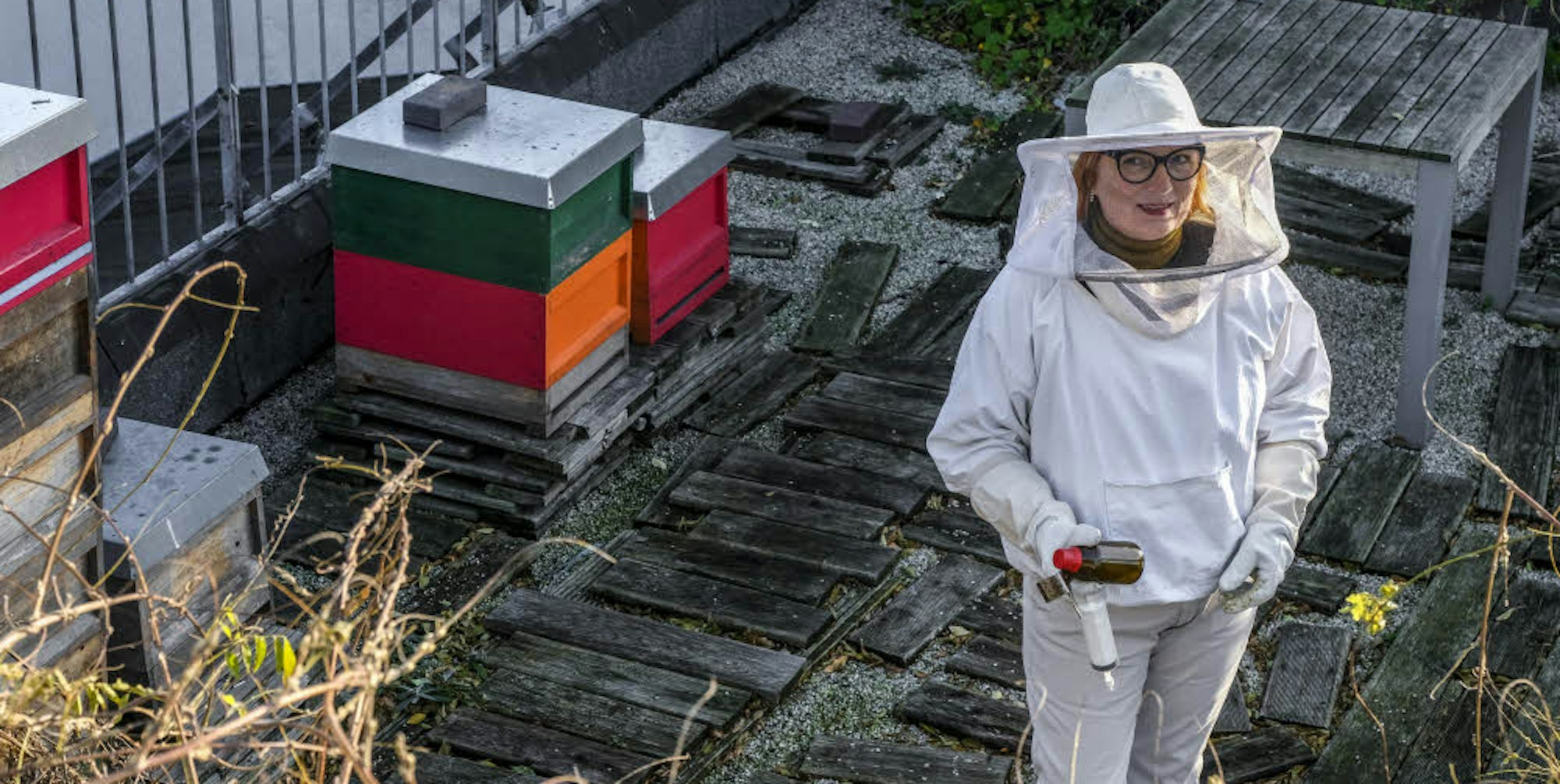 In ihrem Dachgarten gegenüber der Christuskirche hat die Hobby-Imkerin solch einen Rückzugsort geschaffen: fünf Bienenstöcke stehen dort, farbenfrohe Holzkästen mit Metalldeckel, an deren Flugloch reger Betrieb herrscht. Eigentlich sollten die Bienen im Winter im Stock sein, aber „es ist zu warm“, sagt Iris Pinkepank.