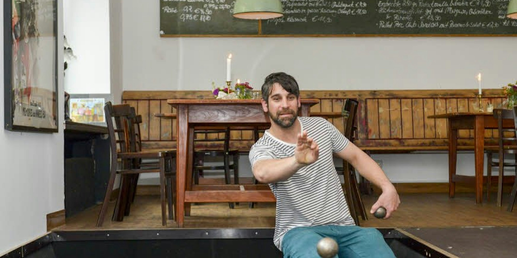 Könner an der Kugel: Kim Rieger bietet seinen Restaurantgästen im „Hardy Kugel“ in der Südstadt auch Boule-Bahnen an. (Foto: Meisenberg)