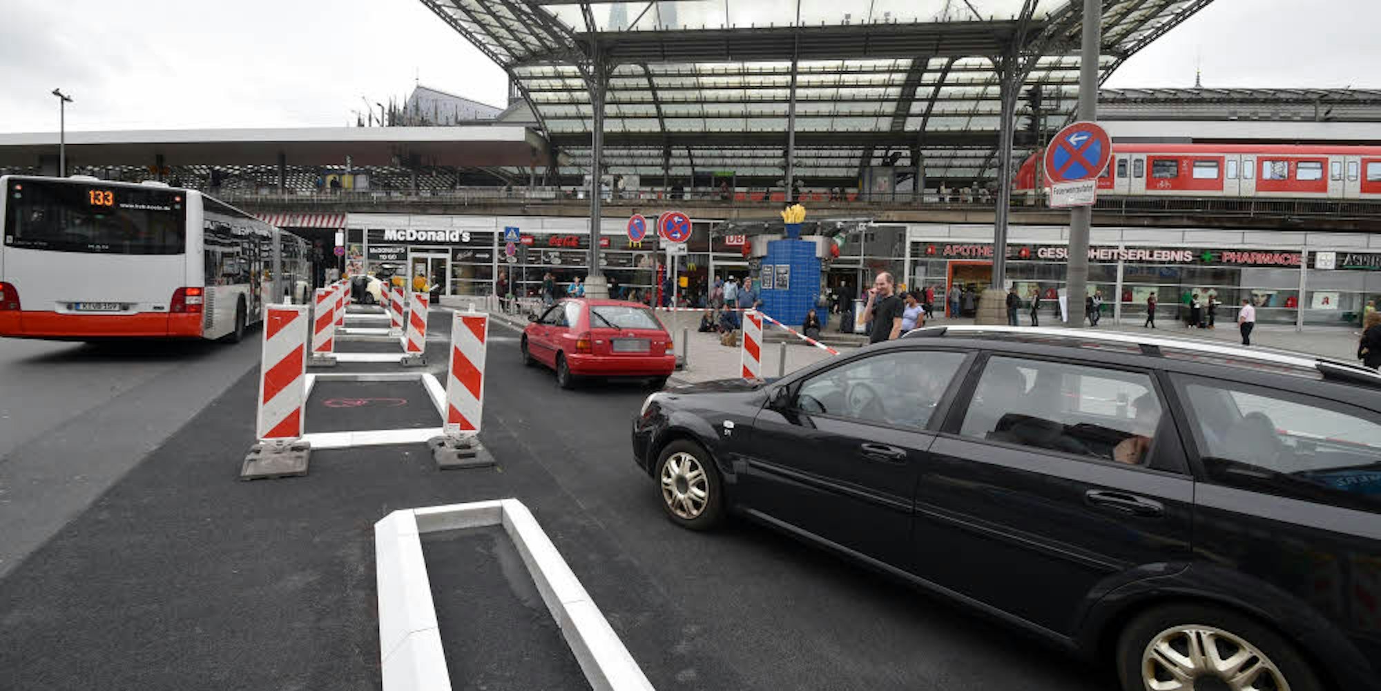 Köln – Die Asphaltdecke auf dem kleinen Stück der Johannisstraße vor dem Breslauer Platz ist neu. Durch das satte Schwarz stechen die weißen Klebeborden noch deutlicher hervor. Sie sollen Ordnung in diesen Kiss-and-ride-Bereich bringen, dort, wo Autofahrer Reisende ausladen, die vom Hauptbahnhof mit dem Zug weiterfahren wollen. Und wo es zum Abschied dann oft noch ein Küsschen gibt.