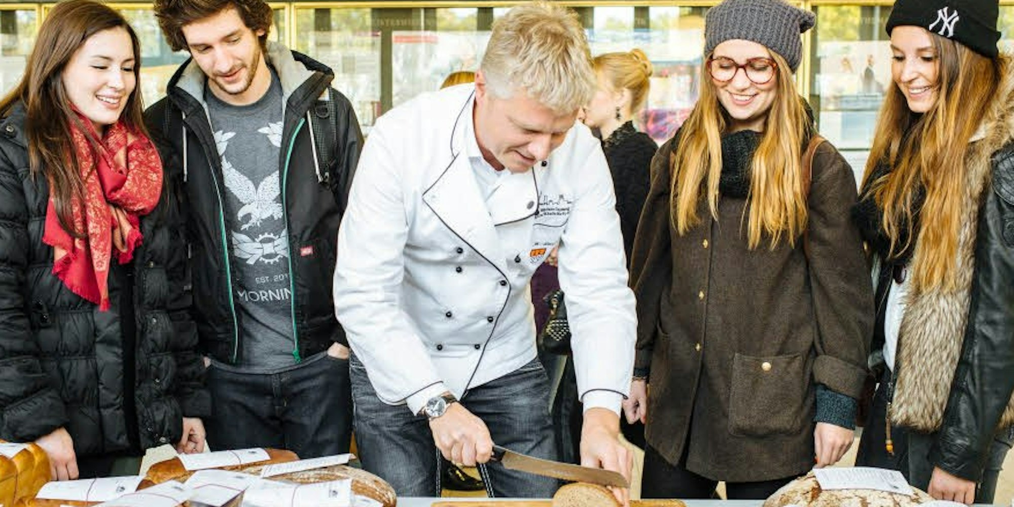 Scheibchenweise Oberländer: Der Obermeister der Bäcker-Innung, Markus Zimmermann, schneidet vor Studenten des Kölners Lieblingsbrot an. (Foto: Belibasakis)