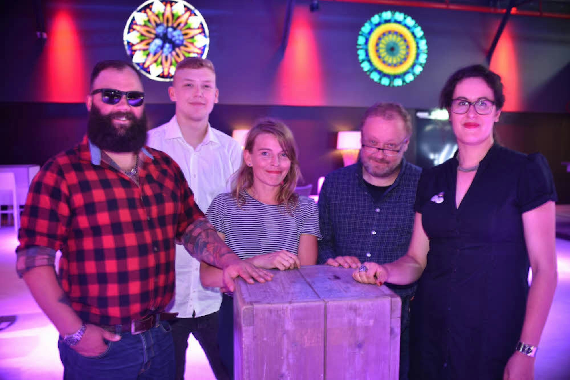 Die Macher von „AllesGuteLive“ stellten Veranstaltern ihre neuen Räumlichkeiten vor: (v.l.) Dan Czichopad, Auszubildender Ilias Petszokat, Sonja Tanner, Robert Kril und Antonia Zweigardt im „Club Volta“.