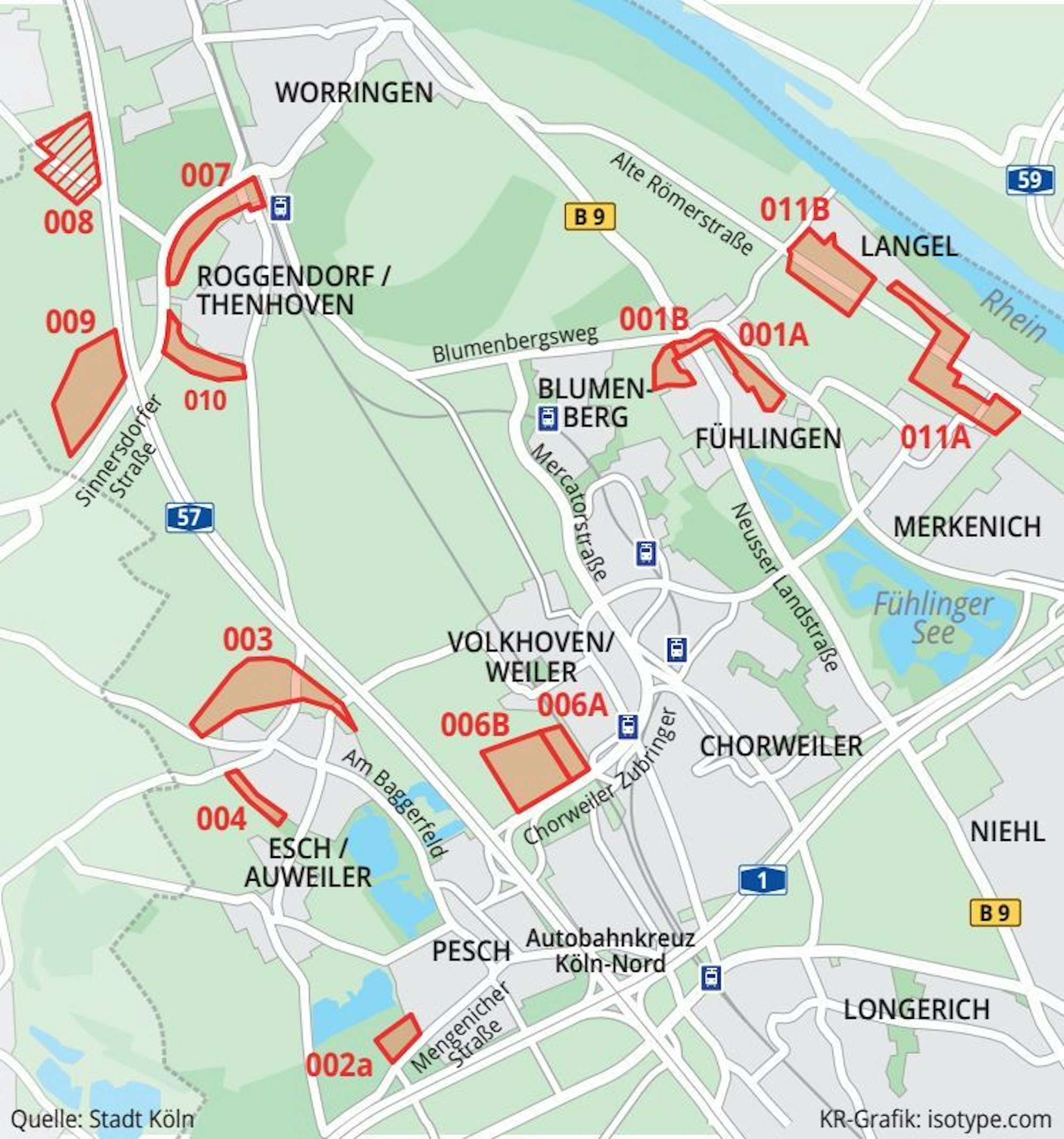 Die rot schraffierten Flächen sind im Regionalplan aufgeführt, wurden aber von den Chorweiler Bezirksvertretern abgelehnt. Die Benennung der einzelnen Flächen richtet sich nach den städtischen Vorgaben.