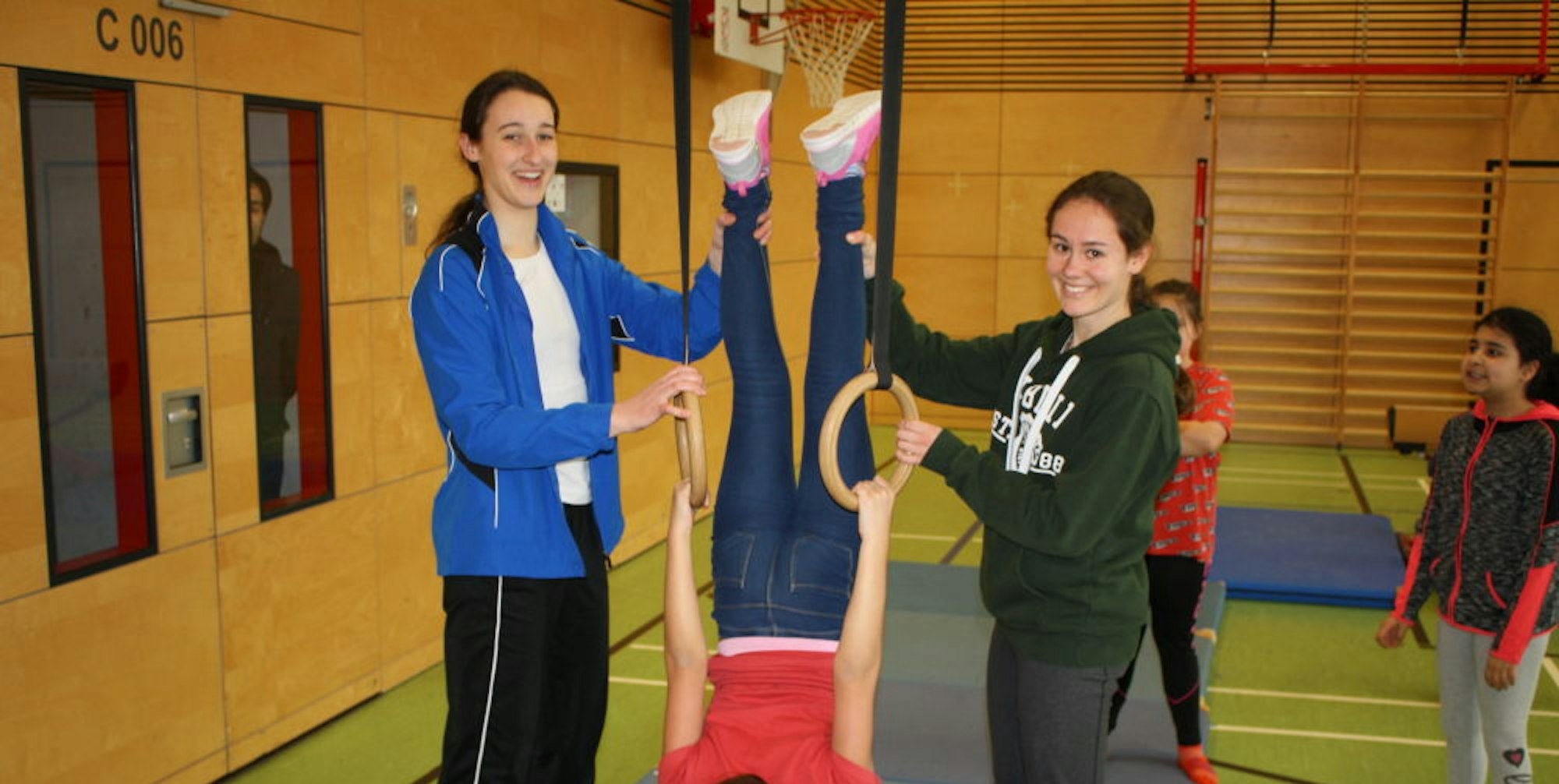 In der Sporthalle der GGS Riphahnstraße haben die beiden Übungsleiterinnen Lea Fahron (19) und Laurin Wolff (20) derweil alles aus- und aufgefahren, was die schuleigene Turnhalle zu bieten hat, während sich ein Dutzend Pänz gut gelaunt an einer Vielzahl von Geräten wie Reck, Ringen oder Schwebebalken versucht und dabei offensichtlich die Bandbreite an Möglichkeiten und die große Auswahl genießt. Andere kriechen durch eine Tunnelröhre aus Stoff, schlagen Purzelbäume oder lassen sich immer wieder vergnügt in eine gut gepolsterte Hochsprungmatte fallen.