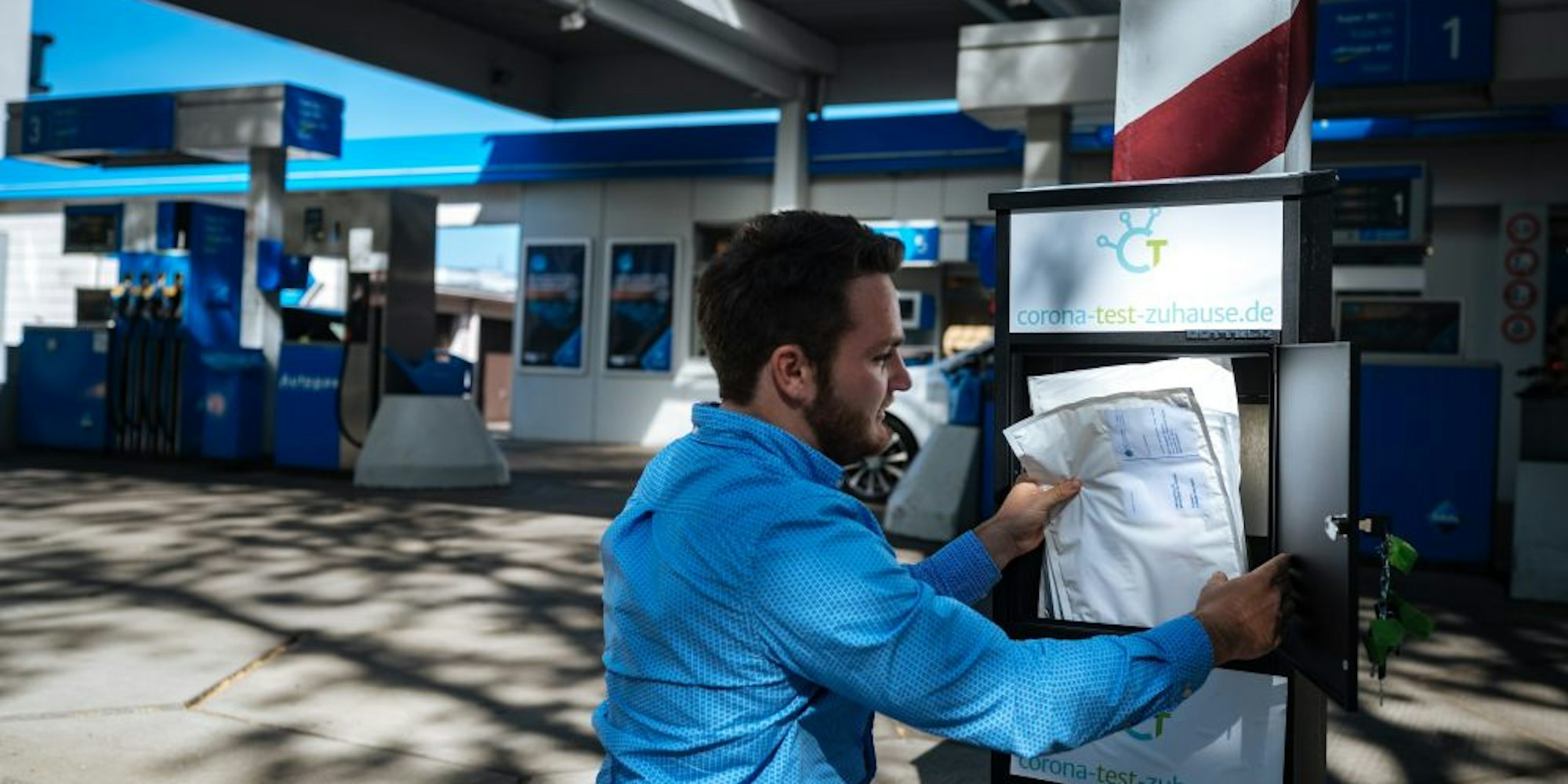 Test an der Tanke: Kaufen kann man den Corona-Test dort nicht, aber einwerfen. Per Kurier geht’s ins Labor.