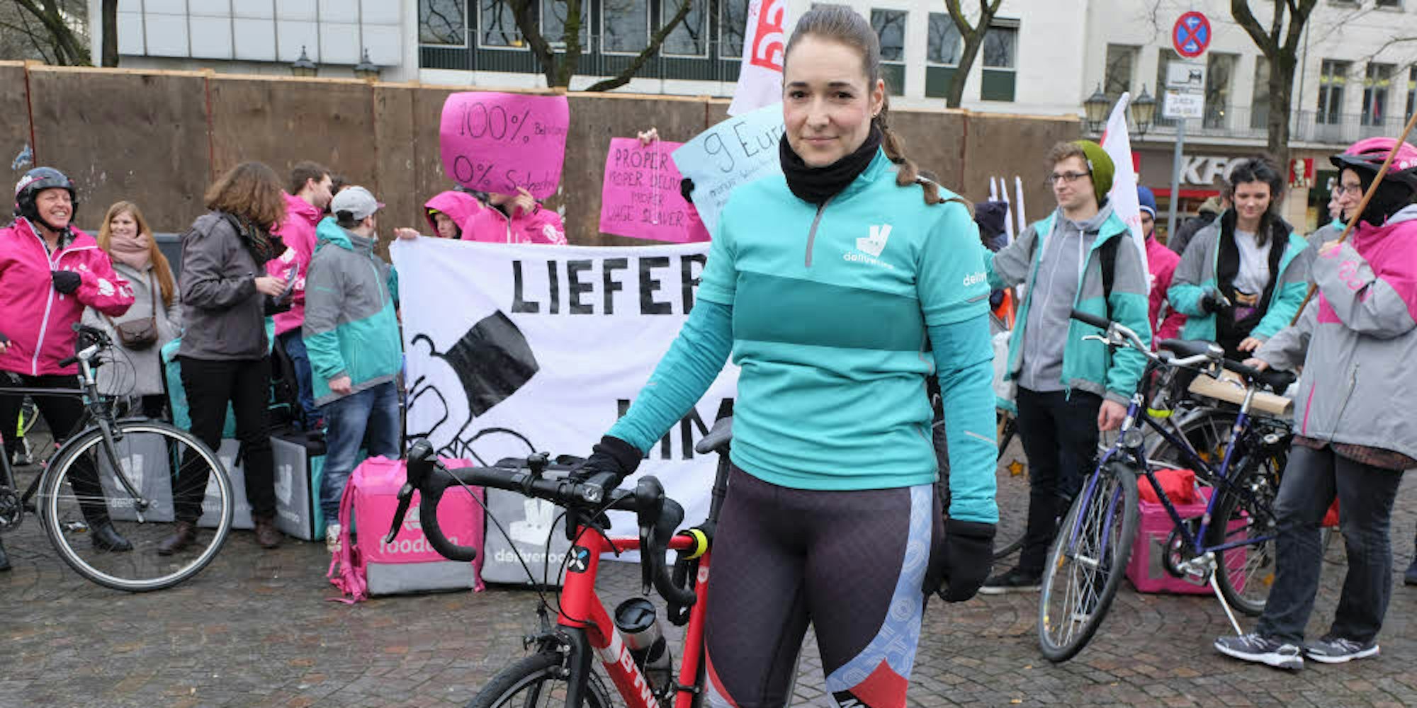 Anfang Januar demonstrierten Fahrerin Sarah Jochmann und ihre Kollegen für faire Arbeitsbedingungen bei Deliveroo und Foodora.