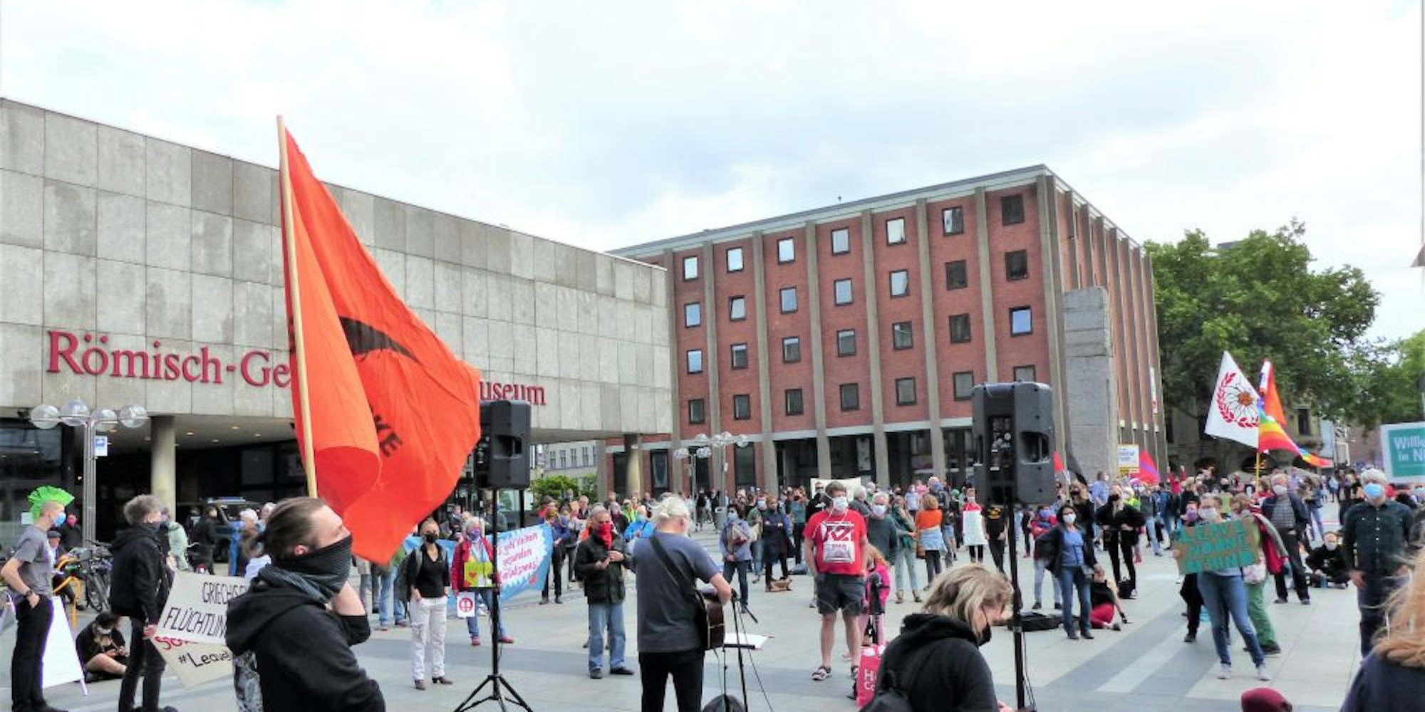 Köln – „Wir sind hier, um inhaltliche Forderungen an die Landesregierung zu stellen, deshalb möchten wir hier keine Parteifahnen sehen“, betont Laura Gey bei der Seebrücke-Kundgebung auf dem Roncalliplatz am Samstag. Die Demo ist wegen der Corona-Pandemie eine von mehr als 50 zeitgleichen Protestaktionen in acht europäischen Ländern. Das Anliegen: sofortige Evakuierung aller Flüchtlingslager.
