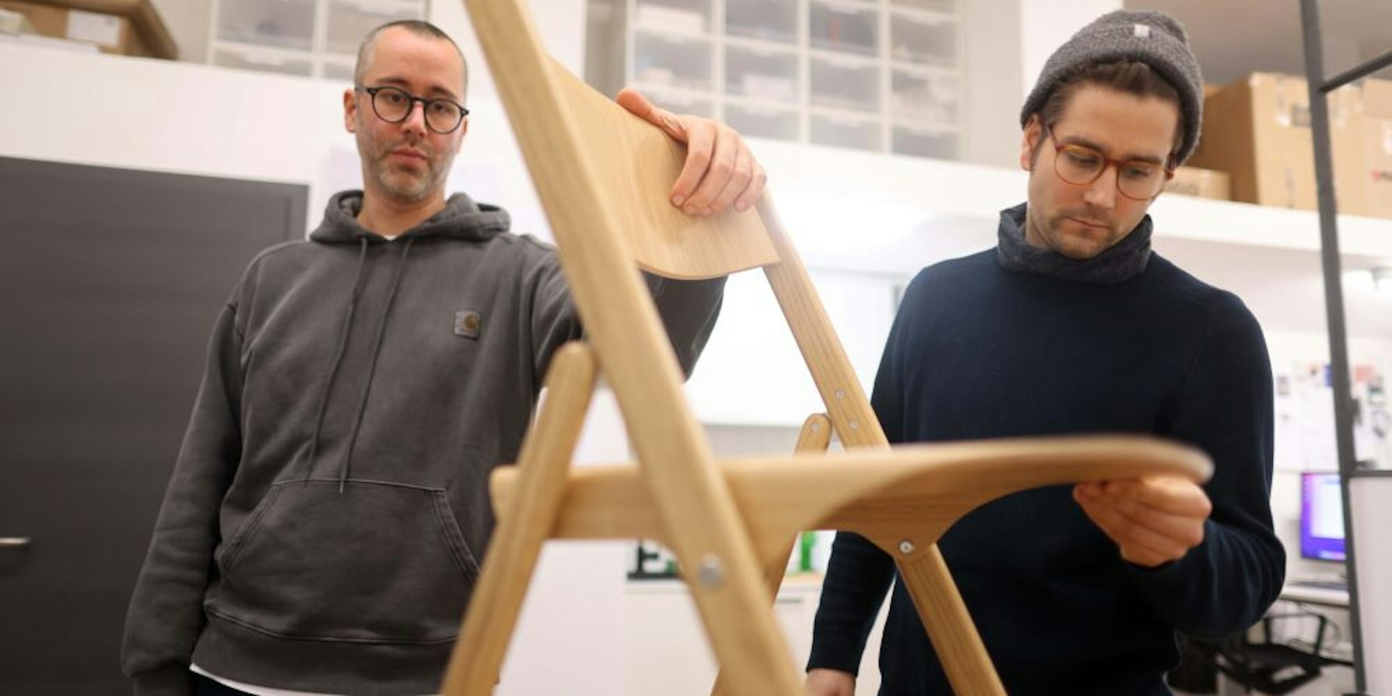 Das Duo legt Wert auf Funktionalität und schnörkellose Formensprache – ohne Starallüren. „Es ist spannend, dem Produkt ein kluges innovatives Detail zu geben“, so Schneider. Einen Klappstuhl aus Holz zu entwerfen, war eine der neuesten Herausforderungen. Anders als Massenware aus Plastik wirkt er stabil wie aus einem Guss, dünne Sperrholzschichten formen sich ergonomisch. „Eigentlich wollten wir ihn auf der Möbelmesse in Stockholm vorstellen“, sagt Florian Kallus, „aber wegen Corona musste sie ausfallen, nun präsentieren wir ihn virtuell.“