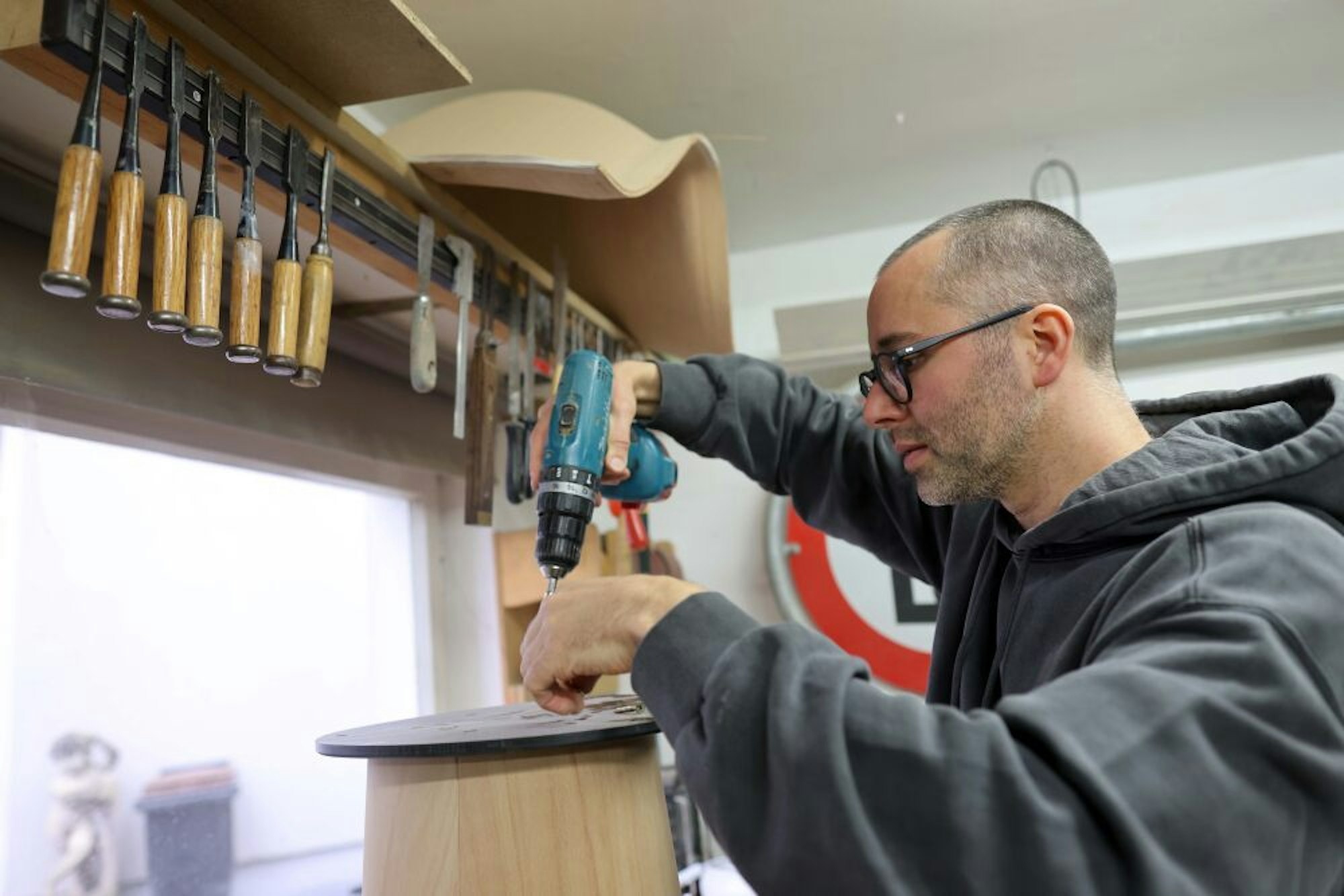 Die aus den Nachnamen zusammengesetzte Marke ist Programm. Die beiden gelernten Tischler studierten in Münster Produktdesign an der Akademie für Gestaltung, Sie setzen auf Zusammenarbeit: „Kunden kommen meistens mit einem Wunsch auf uns zu, wir arbeiten uns rein und machen uns Gedanken, erste Entwürfe – jeder hat dabei einen anderen Blick“, sagen die Teamworker. Während Florian mehr das ästhetische große Ganze im Blick hat, vertieft sich Tüftler Sebastian intensiver in technische Details.
