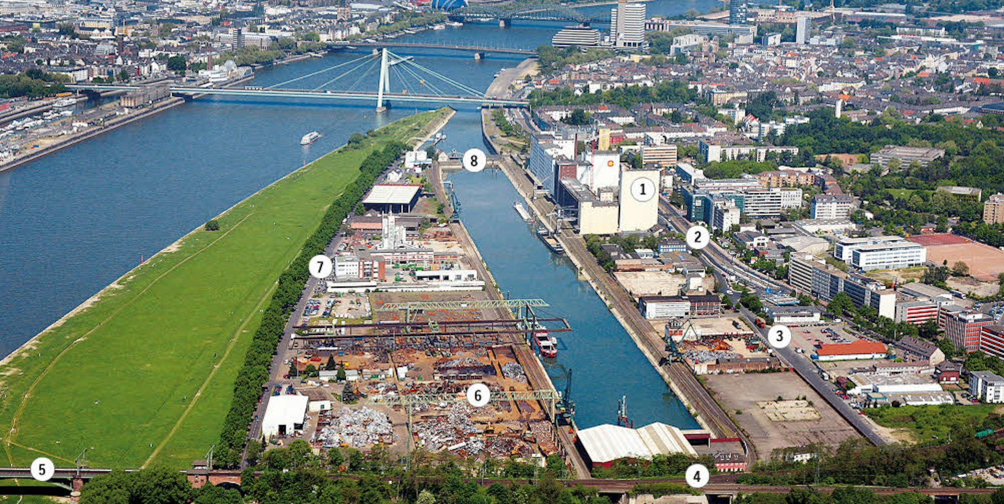 Der Deutzer Hafen mit der Ellmühle (1). Begrenzt wird das Areal durch (2) Siegburger Straße, (3) Poller Kirchweg, (4) Eisenbahntrasse, (5) Südbrücke, (6) Schrottplatz, (7) Alfred-Schütte-Allee, (8) Drehbrücke.