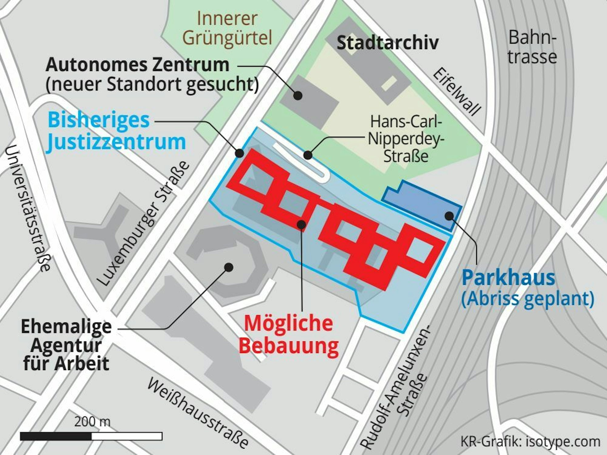 Das H-förmige Gebäude, in dem sie bisher sitzt, wird im zweiten Schritt abgerissen und dort werden zwei weitere Bauten samt Sitzungssälen, Schleusen und einem „Platz der Justiz“ für den Eingangsbereich errichtet. Das Gebäude der ehemaligen Agentur für Arbeit, gleich nebenan an der Luxemburger Straße, wird derweil „ertüchtigt“, so dass Land- und Amtsgericht dort vorübergehend einziehen können. Im letzten Schritt folgt der Abriss des Hochhauses und die zwei weiteren Neubauten an der Ecke Luxemburger Straße/Hans-Carl-Nipperdey-Straße. Die nach dem bekannten und auf dem Kölner Südfriedhof zur Ruhe gebetteten Juristen benannte Straße soll zudem gekappt werden. Nur noch Busse sollen bis zur Haltestelle vor dem Justizzentrum fahren.