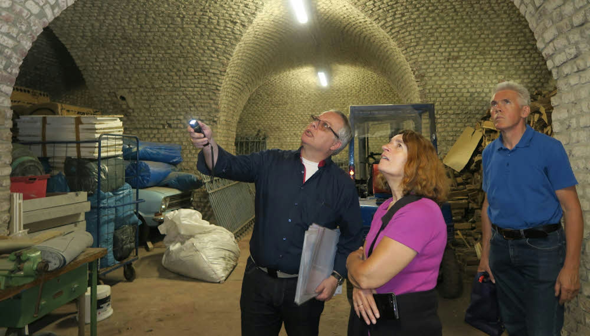 Als Filmkulisse hat sich Fort IV am Freimersdorfer Weg mehrfach bewährt, und auch sonst hat es manche kuriose Geschichte zu erzählen. Werner Müller, freier Stadthistoriker und Betreiber des Historischen Luftfahrtarchivs Köln, kennt die meisten, dazu gibt’s detaillierte Erläuterungen zur militärischen Bedeutung der Anlage. Stoff genug für eine rund dreistündige Führung auf Einladung der Bürgervereinigung Ehrenfeld, zu der sich rund 20 Teilnehmer eingefunden haben. Von den Veranstaltern waren sie ausdrücklich aufgefordert worden, eine Taschenlampe mitzubringen, denn meist geht es durch – wenn überhaupt – schlecht beleuchtete Gänge mit unebenen, von allerlei Geröll und Unrat übersätem Boden. Treppauf, treppab, bald weiß man nicht mehr so recht, ob man noch im Erd- oder schon im Untergeschoss ist.