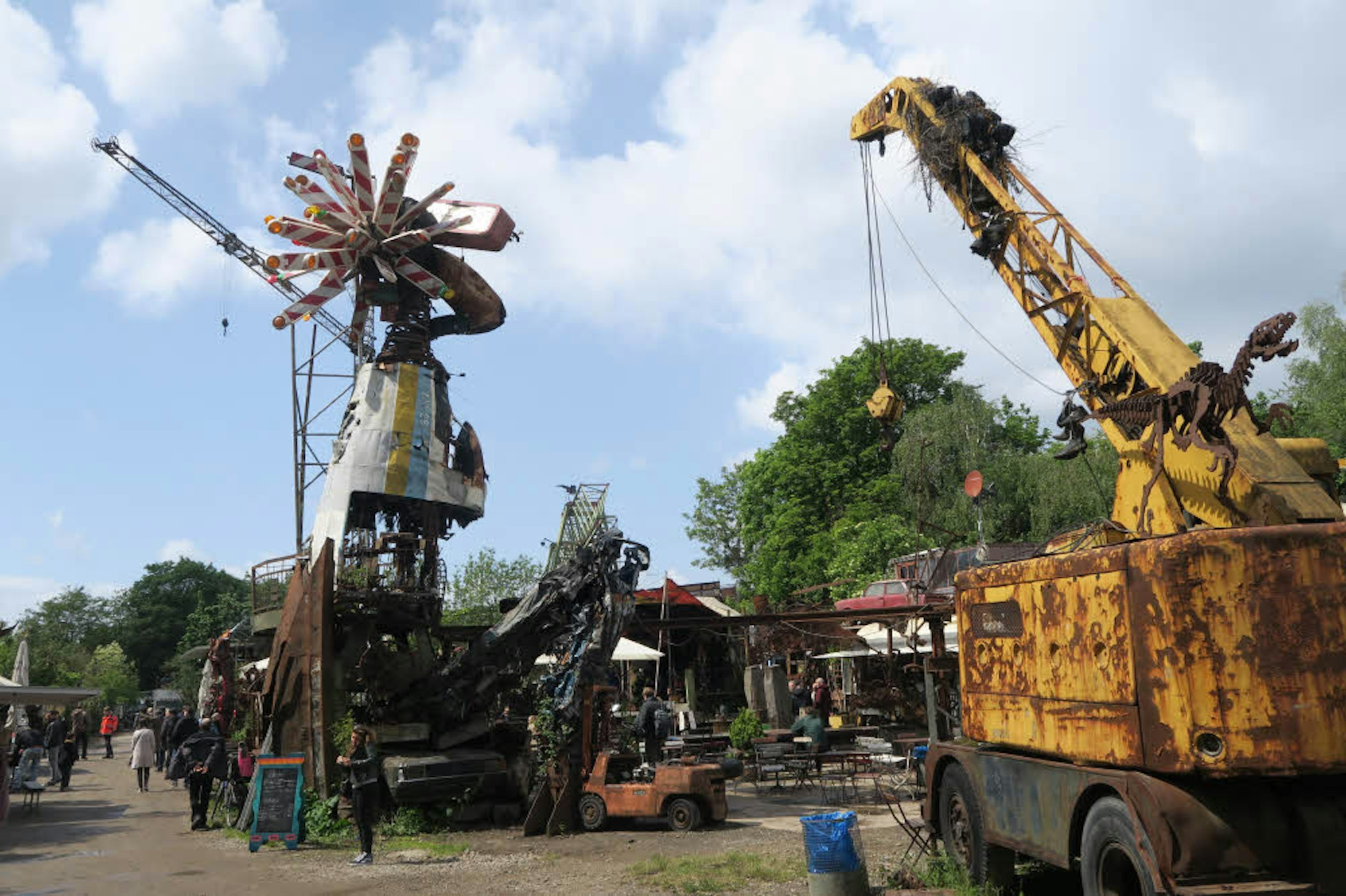 Ehrenfeld – „Hat was“, fasste die nicht mehr ganz junge Dame ihre Eindrücke beim Verlassen des Odonien-Geländes zusammen. Anlässlich der zweitägigen Kunstroute Ehrenfeld war im Freiluftatelier an der Hornstraße ein „Tag des offenen Tors“ angesetzt, mit Biergarten, kubanischer Live-Musik, Kinderprogramm und Führungen durch den Skulpturen-Park, den Odo Rumpf aus den Überresten des technischen Fortschritts konstruiert hat. Im Mittelpunkt stand die neue, zehn Meter hohe Installation „Mutantrion“ aus rostigen Metallteilen, Sofas und Warnbaken – theoretisch begehbar, was angesichts der unübersehbaren Zeichen des Verfalls indes nur zögerlich angenommen wurde.