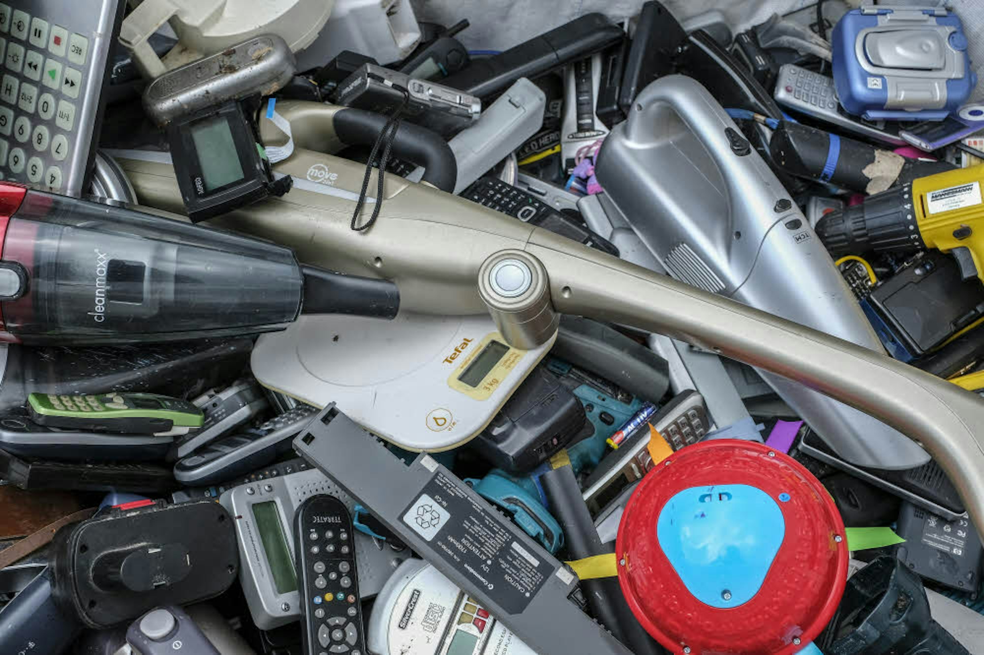 Kleingeräte stapeln sich bei den AWB in Ossendorf, Fernseher werden dort separat gesammelt.