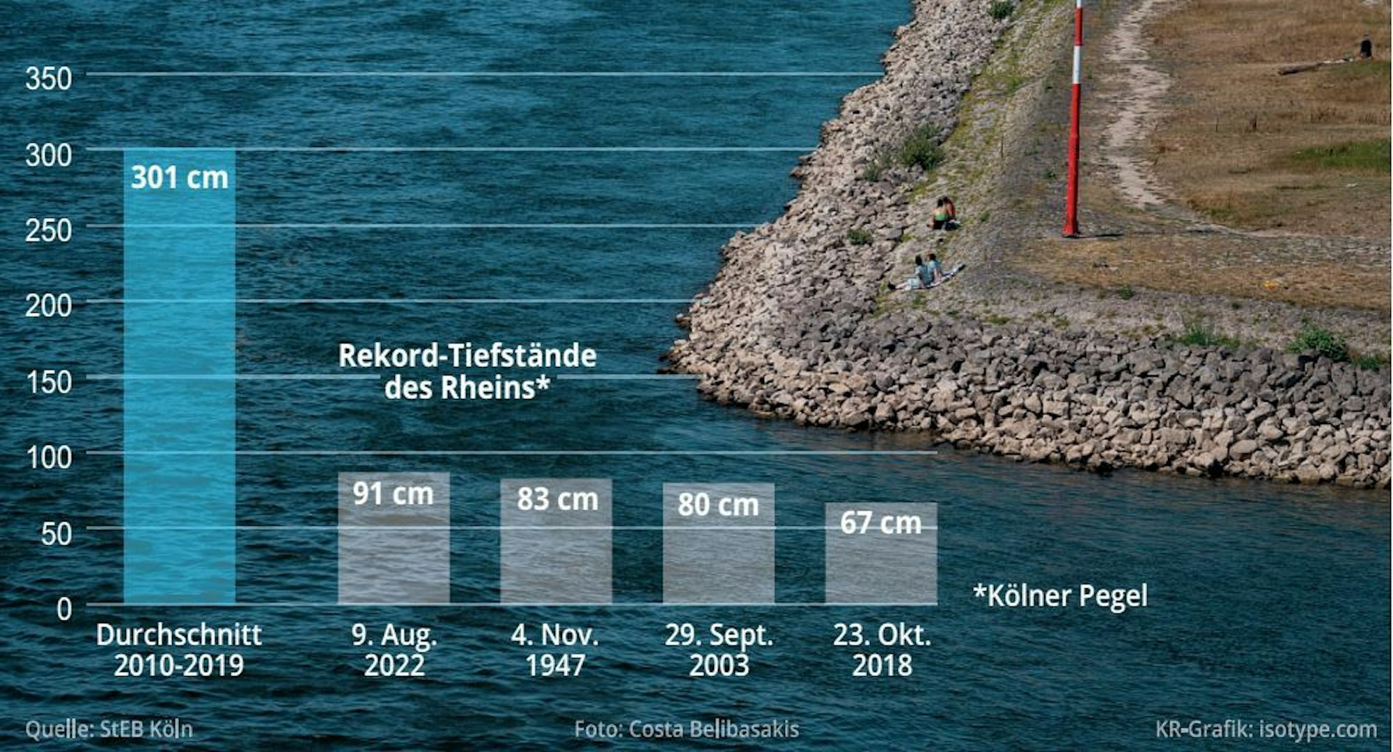 Weniger Ladung bedeutet mehr Fahrten und höhere Kosten, Unternehmen drohen Materialengpässe. Im Dürrejahr 2018 nahm der Warentransport auf deutschen Flüssen und Kanälen um rund elf Prozent ab, das Wirtschaftswachstum kam zum Erliegen. Auch Ausflugsschiffe werden ausgebremst. Wegen des Niedrigwassers kann die Köln-Düsseldorfer (KD) ihren historischen Schaufelraddampfer „MS Goethe“ nicht mehr auf dem Mittelrhein einsetzen. Die Siebengebirgstour von Köln nach Linz geht derzeit nur bis Königswinter, weil die Wassertiefe an einigen Anlegern nicht ausreicht.