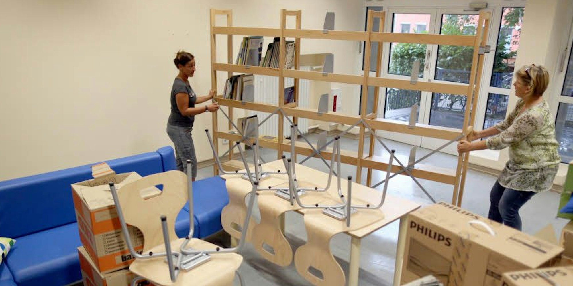 Köln – Die „Lichtung“ zwischen Wald- und der Wiesenklasse sieht bis ganz kurz vor dem Start der neuen Grundschule noch aus wie Kraut und Rüben: Nicht nur in diesem Spiel- und Entspannungsraum zwischen den Klassenräumen rückte das Team bis zur letzten Sekunde noch Sofas zurecht und räumte Regale ein, während auf dem Flur Bauleute Treppengeländer für die i-Dötzchen mit Netzen sicherten und dringendste noch offene Arbeiten erledigen. Der alte Schulname Nordparkschule hängt noch groß am Altbau, das neue Schild ist noch nicht montiert. Auch bei Küche und Essraum müssen alle bis auf Weiteres improvisieren. Lehrer organisierten Bierbänke für die provisorische „Mensa“ in ihrem späteren Teamraum.