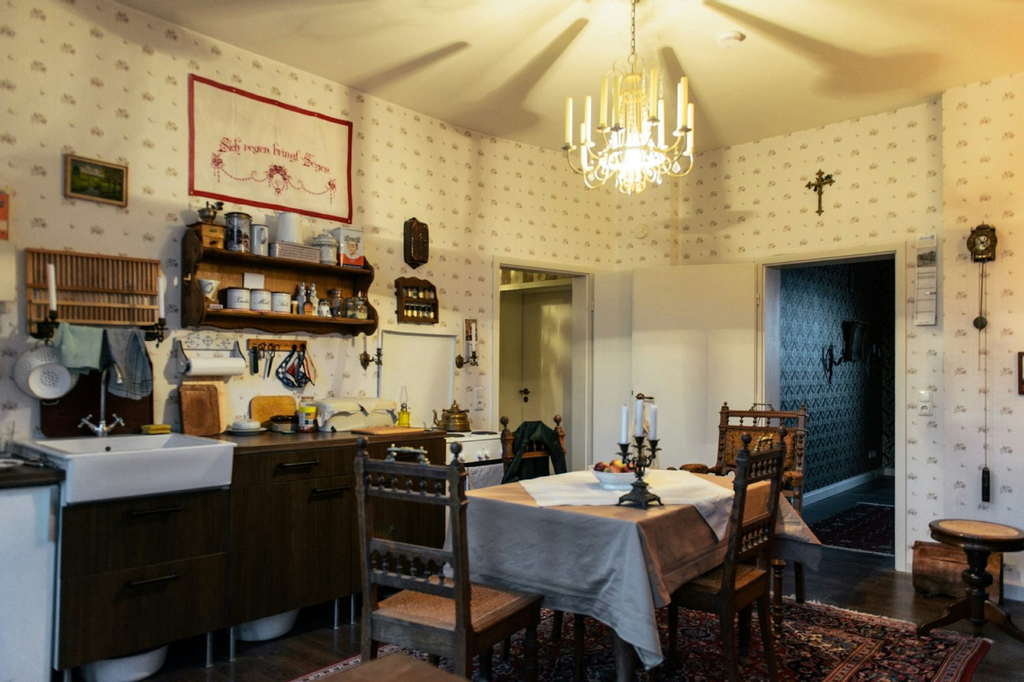 Schon wieder läutet es in der Zwei-Zimmer-Wohnung. Fünf Uhren zum Aufziehen hängen an den Blümchentapeten und machen sich mehrmals die Stunde bemerkbar. Daneben Porträts von den Kaisern Wilhelm I. und II. und der Spruch „Sich regen bringt Segen“, in ein Tuch eingestickt über der Küchenzeile. „Das war früher so Usus“, sagt Schmitz. Die Küche hat leider einen Elektroherd, bemängelt er. Mit Kohle zu heizen sei in der Mietwohnung nicht möglich. „Und wäre irgendwo ein Brunnen – ich würde ihn benutzen.“ Eine Waschmaschine hat er sich dennoch zugelegt, aus gutem Grund, wie er sagt. Anderthalb Jahre wusch er jeden Samstag im Keller die Wäsche mit der Hand. Mit nur mäßigem Ergebnis.