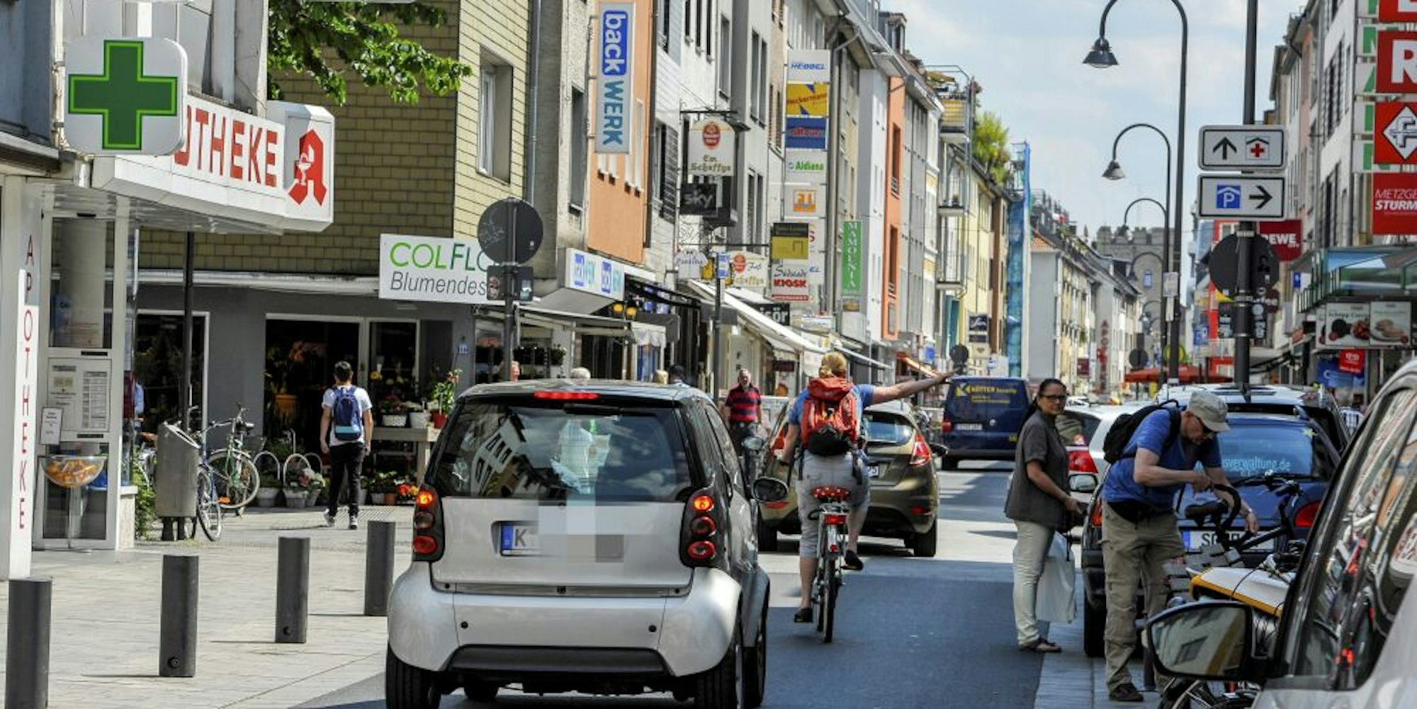 Eng geht es zu auf der Severinstraße. Autos dürfen Radfahrer nur überholen, wenn sie 1,50 Meter Abstand einhalten.