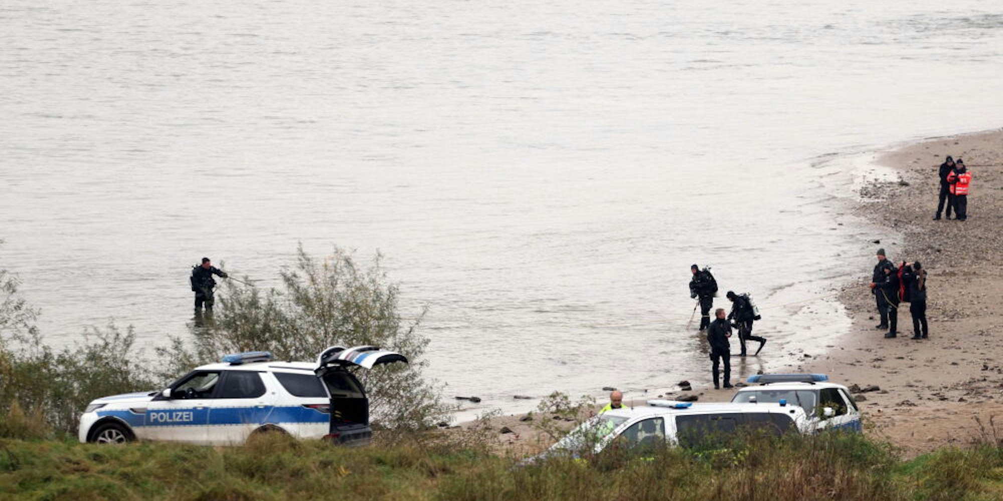 Polizisten suchten nach dem Fund der Frauenleiche das Rheinufer am Niehler Hafen stundenlang ab.