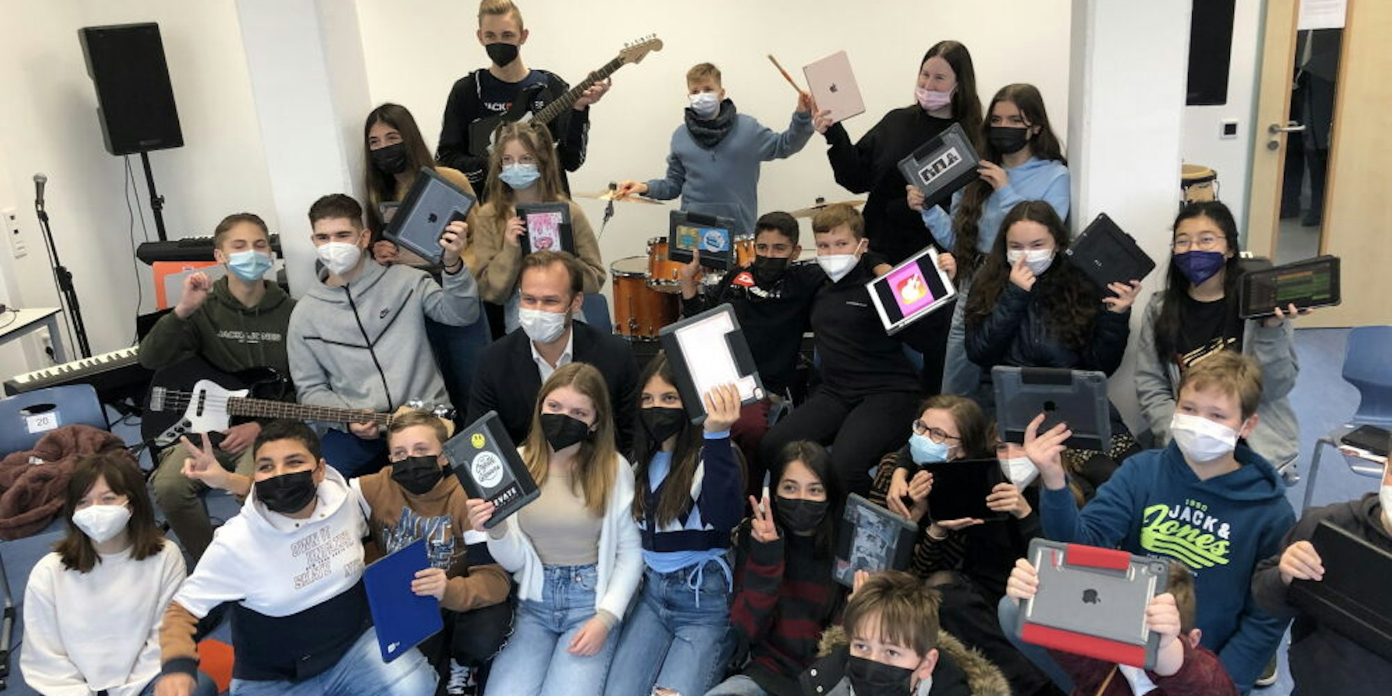 Gruppenbild der Musikklasse mit Schuldezernent (Mitte): Die Siebtklässler produzierten Songs mit Ipad-Unterstützung.