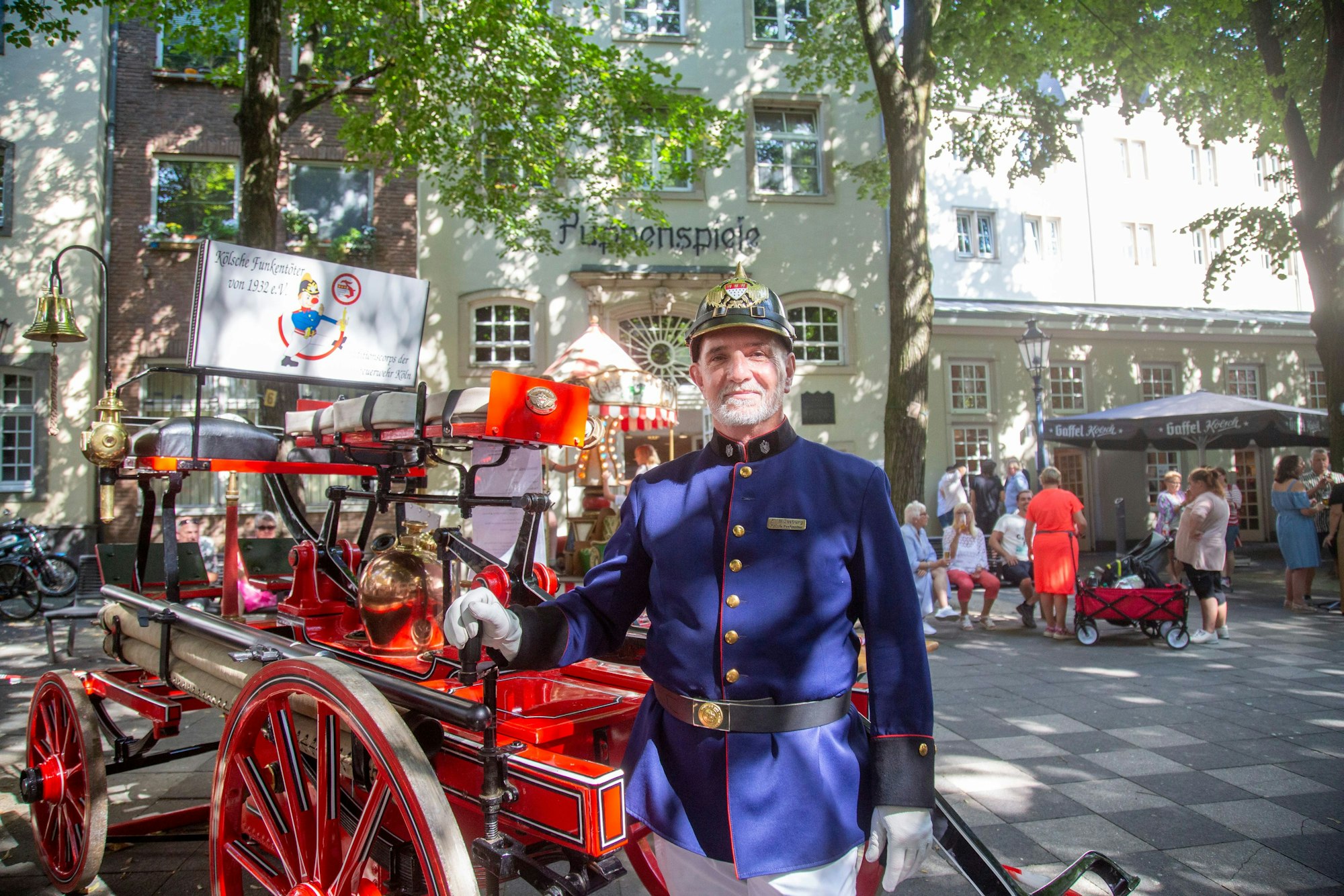 Mitten drin Marlene, die sich über dieses kreative „Britz erav“ freut. Sie sei schon als Kind hier gewesen, habe sich aber aus Angst vor dem Teufel auch mal hinter der Bank versteckt. „Das ist Kölner Kultur, Sprache. Lieder mitzusingen, tolle Atmosphäre – wie früher.“ Benji, ihr kleiner Hund, hat sich inzwischen bei der Feuerwehr niedergelassen. Falls es mal brennt, hat das Traditionskorps der Kölner Berufsfeuerwehr seine historische Handdruckspritze von 1886 zum Theaterfest auf den Eisenmarkt gestellt: restauriert und voll funktionsfähig. „Theoretisch und auch praktisch“, sagt Timo Frischleder, 2. Vorsitzender der „Kölsche Funkentöter von 1932“ und verteilt Orden – vor allem an die Kinder. Auch Elefant Monti, Liebling der Kinder, quält sich bei der Hitze am Samstag. Zur Belohnung gibt's einen Orden auf den Rüssel.
