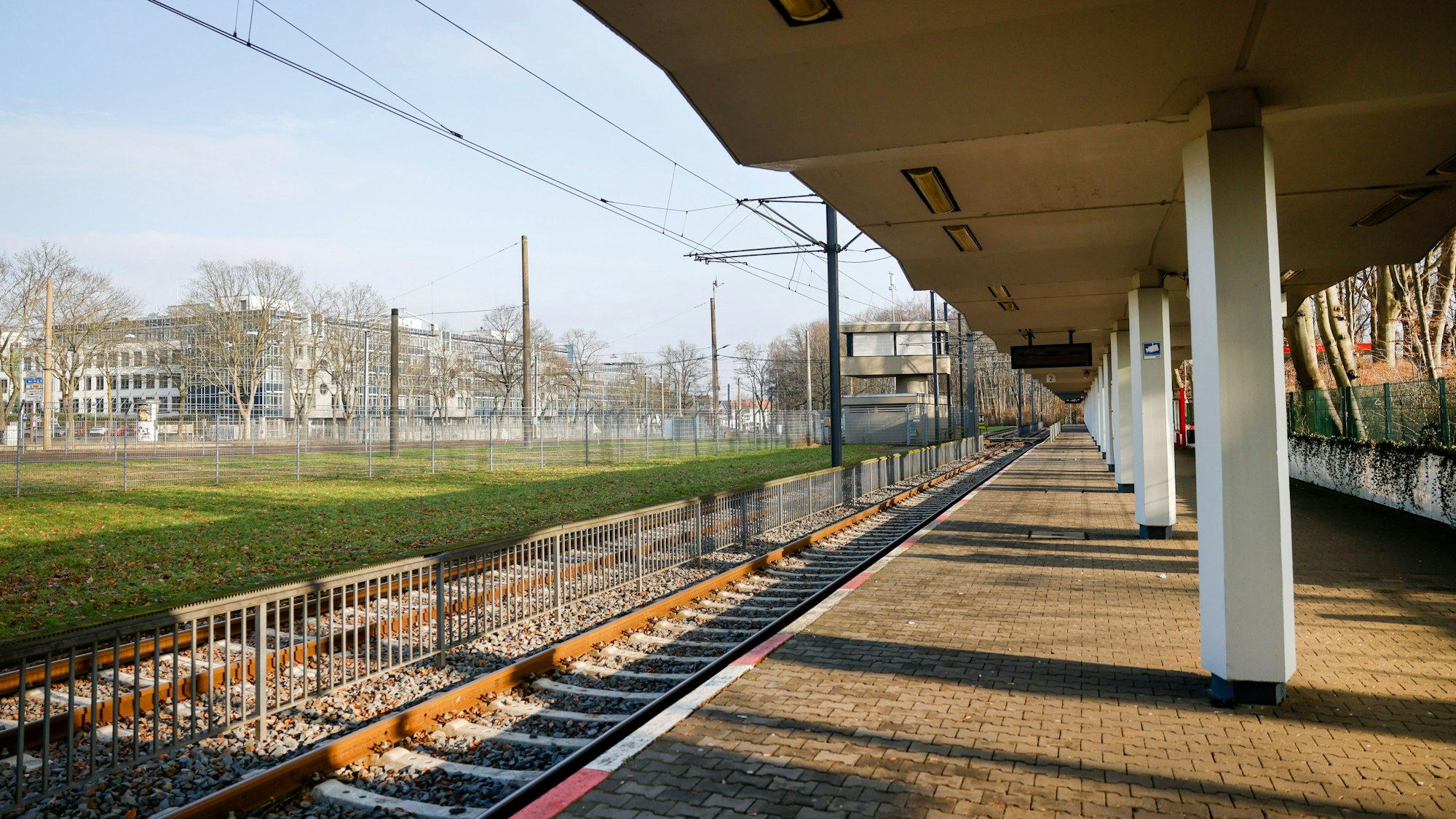 Was künftig für die ganze Strecke der Linie 1 gelten wird, davon ist auch diese Sonderhaltestelle nicht ausgenommen: Die KVB wollen auf der sogenannten Ost-West-Achse 90 Meter lange anstatt 60 Meter lange Stadtbahnen einsetzen. Damit sollen die Kapazitäten auf der chronisch überlasteten Linie erweitert werden. Also mal eben den jetzigen Bahnsteig verlängern? So einfach ist es leider nicht. „Eine Variantenuntersuchung zeigt, dass eine einfache Verlängerung der Bahnsteige an der Haltestelle aufgrund technischer und infrastruktureller Restriktionen im Bestand sowie landschaftsschutzrechtlicher Belange nur mit einem erheblichen baulichen, finanziellen und umweltbezogenen Mehraufwand umsetzbar ist“, heißt es dazu in einer Beschlussvorlage der Verwaltung. Auf Deutsch: Es wird kompliziert und teuer.