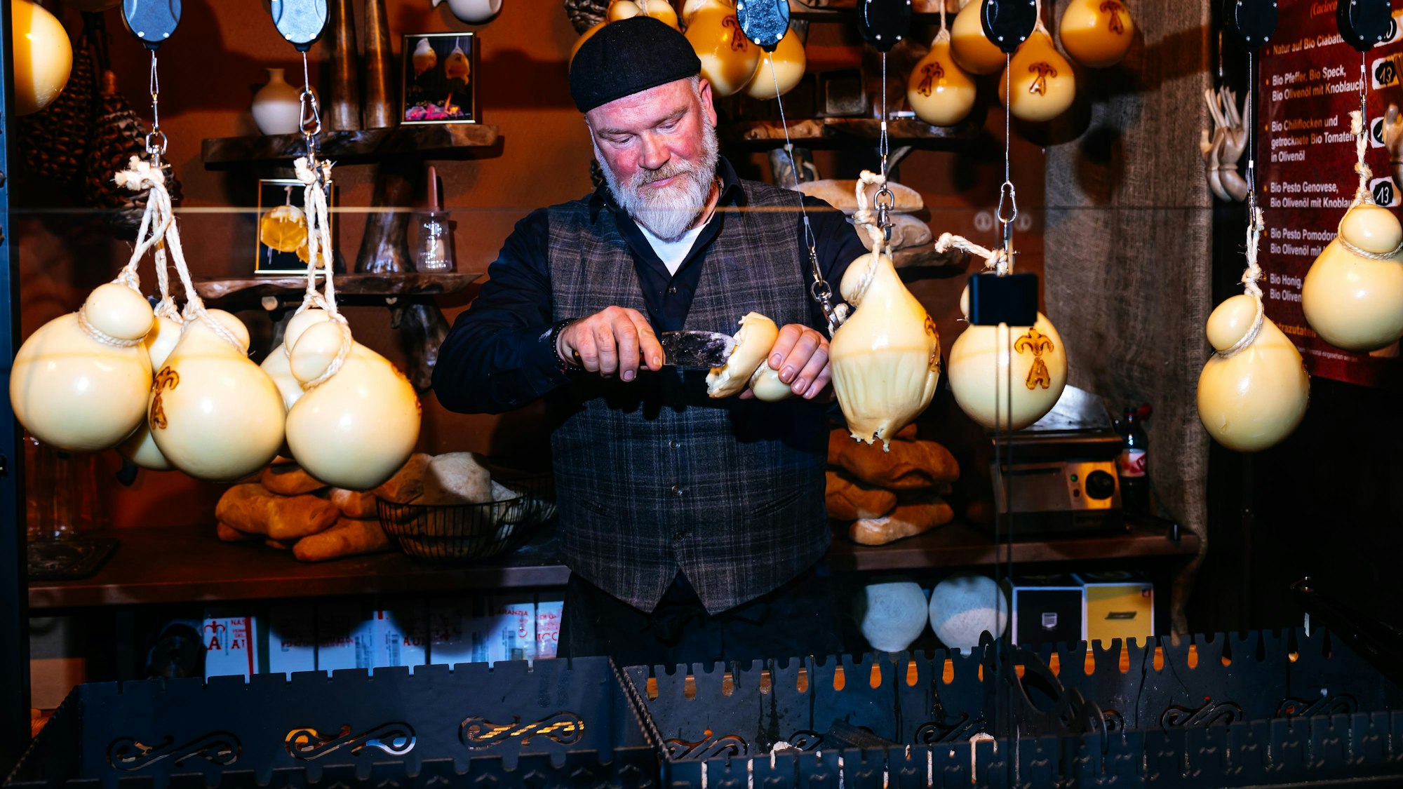 Erstmalig auf einem Weihnachtsmarkt in Deutschland: der geschmolzene Caciocavallo aus Apulien.
