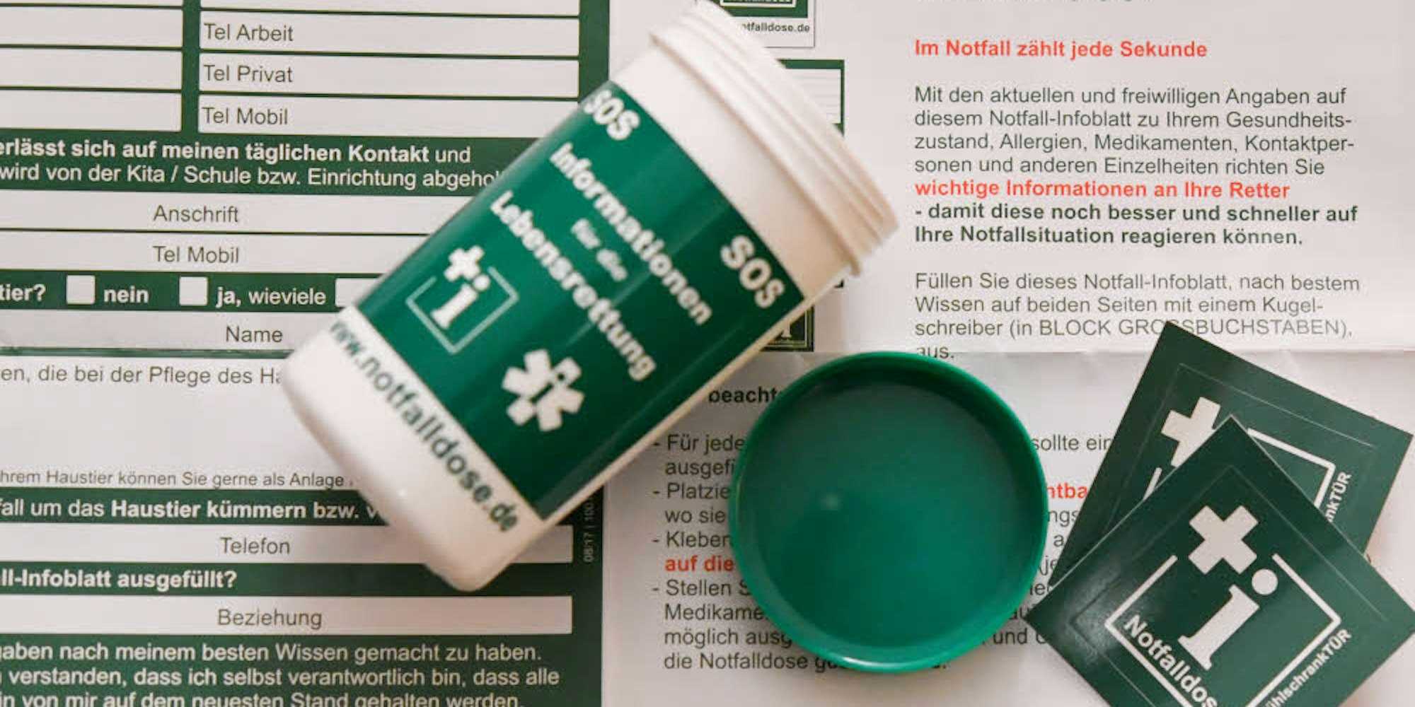 Ein Aufkleber an der Wohnungstür verrät dem Rettungsdienst, dass sich eine Notfalldose im Haus befindet, diese sollte der Einfachheit halber im Kühlschrank aufbewahrt werden. Die Feuerwehr beharrt nicht auf dem Kauf einer solchen Dose, ein Aktenordner auf dem Wohnzimmertisch reiche auch aus, betont Lechleuthner. „Die Informationen sollten griffbereit sein, denn häufig werden diese im Notfall nicht schnell genug gefunden“, meint der Notarzt. Die Kölner Seniorenvertretung verteilt derzeit insgesamt 10 000 Notfalldosen in der Stadt. (tho)