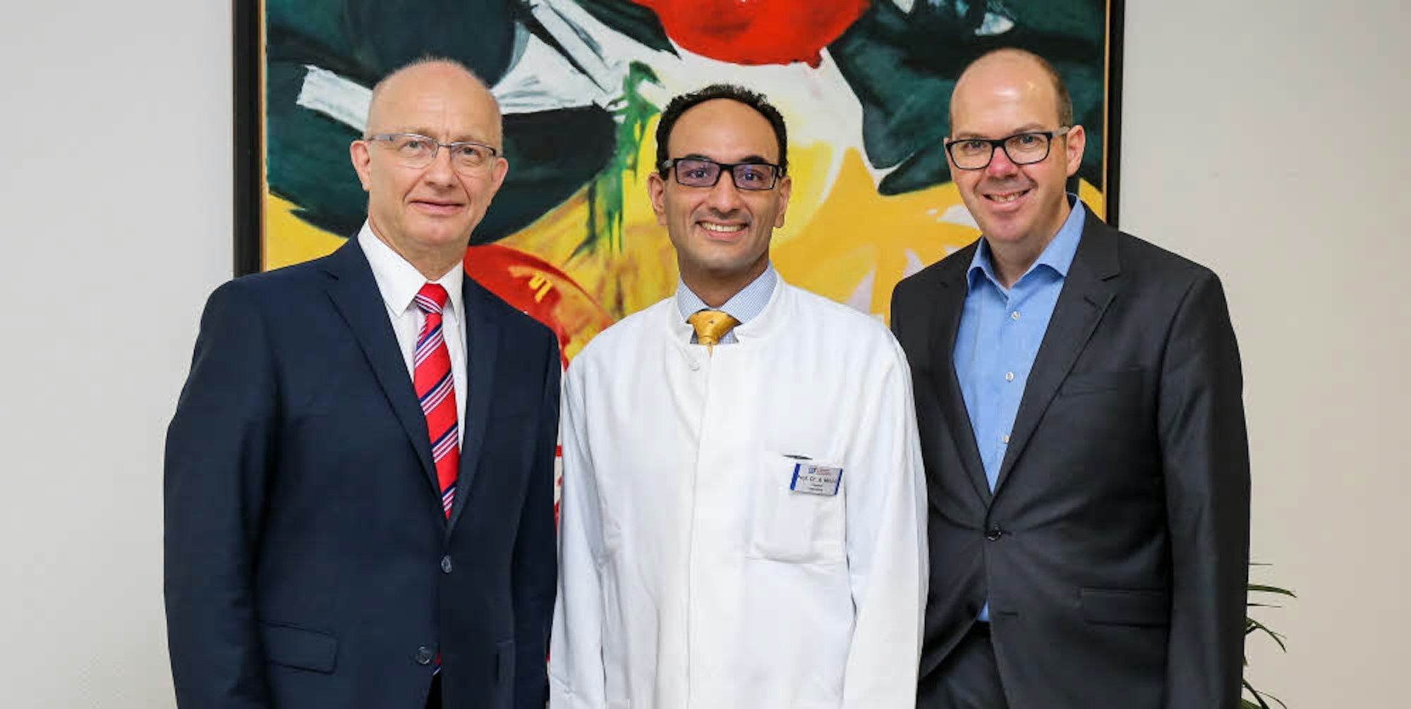 Neuer Chefarzt: Geschäftsführer Frank Dünnwald (r.) verabschiedet Joachim Wustrow (l.) und begrüßt Amir Minovi (M.).