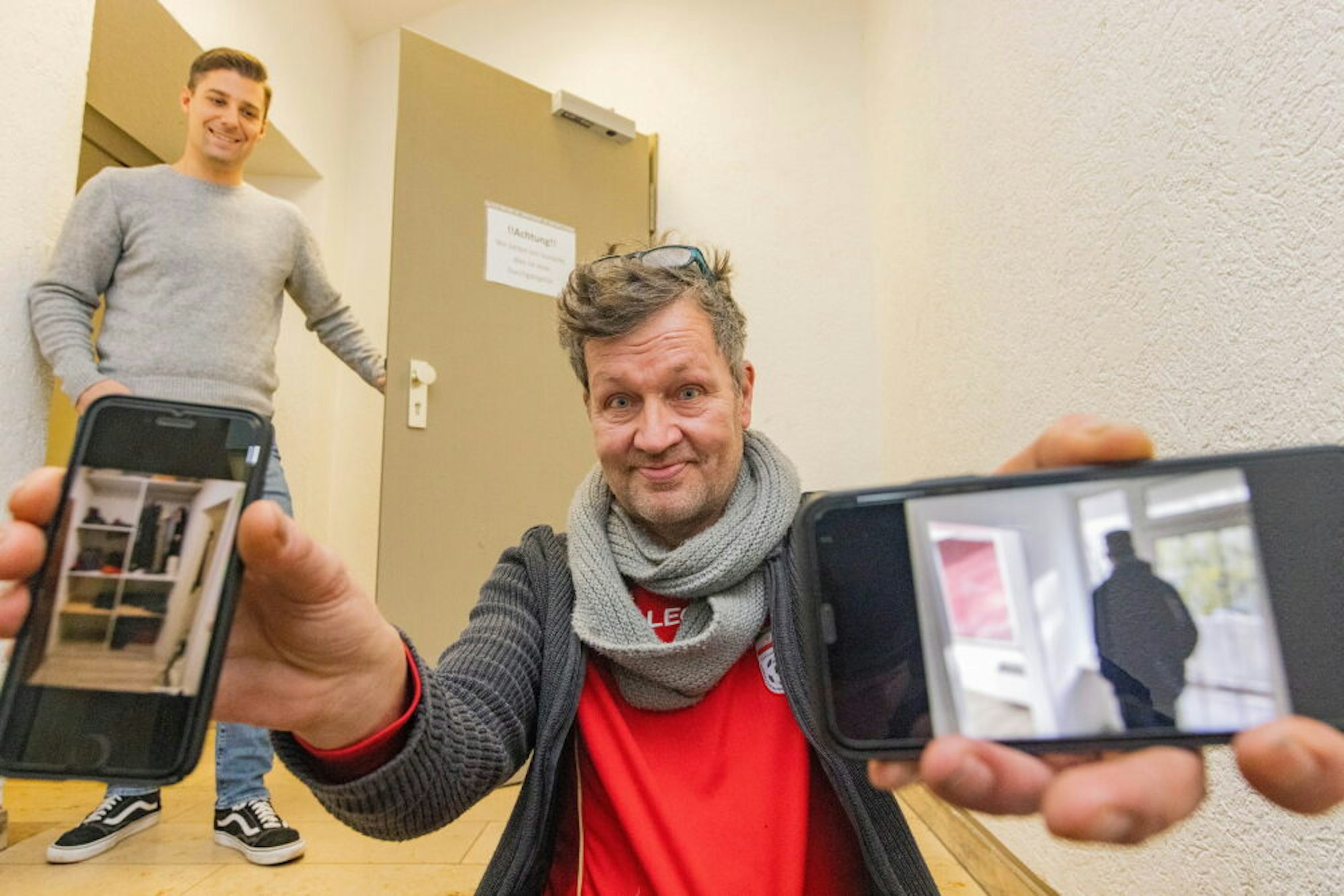 Selbst gebaut hat Frank Emig (vorne) den Schrank in einer Nische seiner neuen Wohnung.