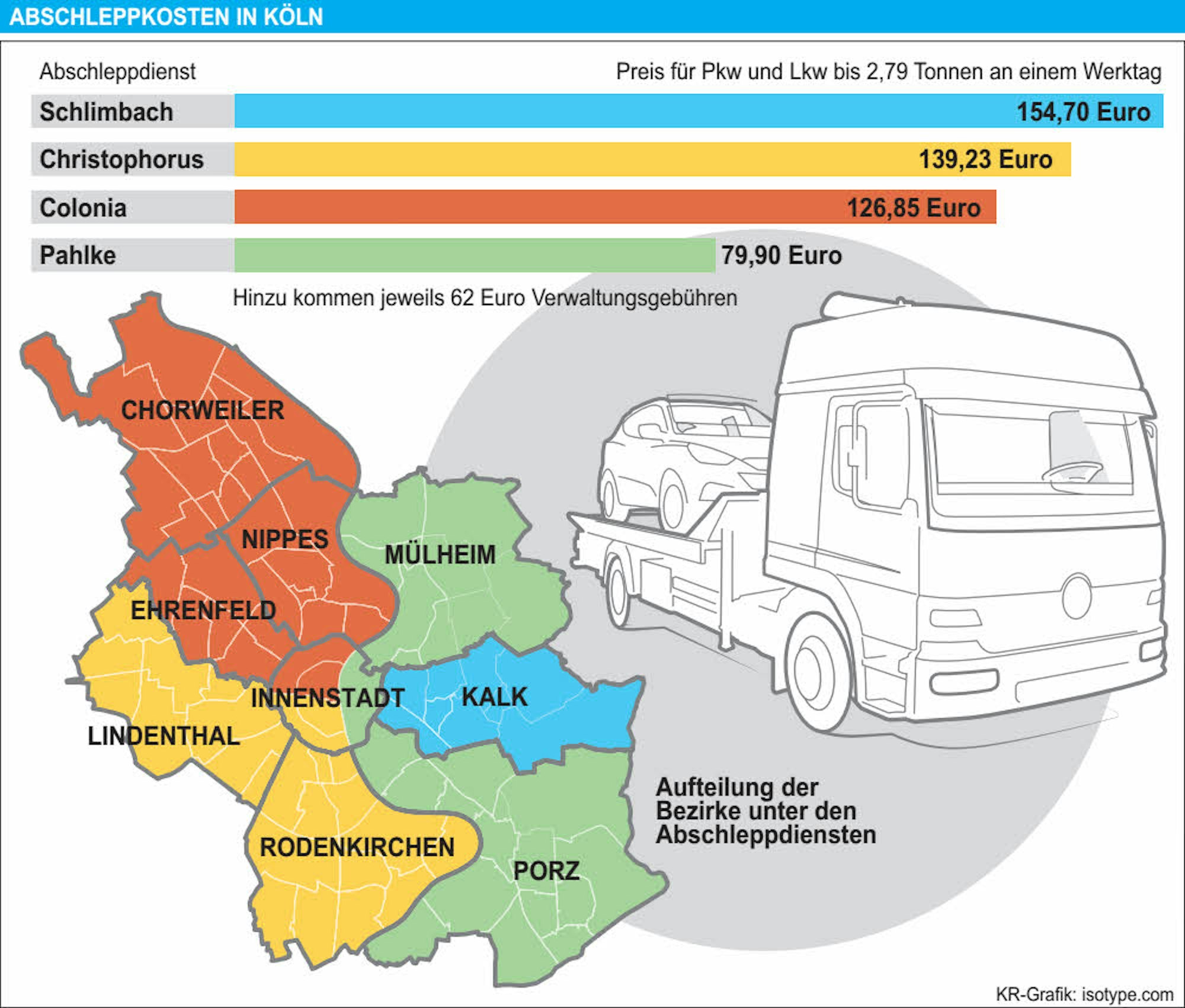 Das Abschleppen von motorisierten Zweirädern ist meist etwas billiger als das Abschleppen eines Personenwagens – außer in Chorweiler, in der Neustadt und der Altstadt Nord. Da zahlen Kradfahrer 11,90 mehr. Und wer sein Auto nicht schnell genug beim Abschleppunternehmer auslöst, hat weitere Kosten zu erwarten: die „Unterstellgebühr“. Sie liegt zwischen 4,76 und 5,95 Euro je Tag und kann sich ganz schön summieren.