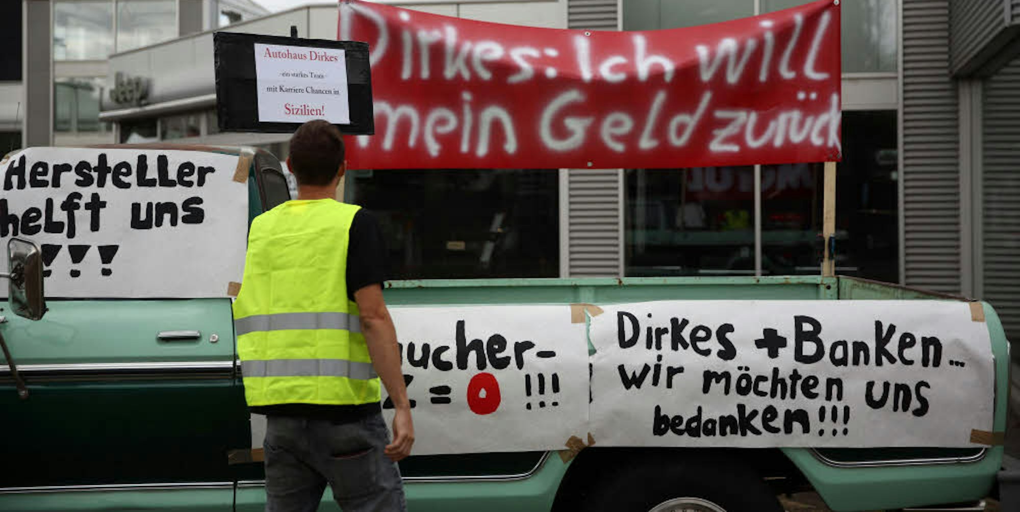 Eigentlich hat die Ehrenfelder Filiale der Autohausgruppe Dirkes auch samstags geöffnet. Doch an diesem Wochenende bleibt der Laden zu. Der Verkaufsraum liegt im Dunkeln, auch die Türen sind geschlossen. Lediglich zwei Sicherheitsleute stehen am Tor. Ihr Job: Ein Auge auf die rund 25 verärgerten Kunden haben, die an der Straße vor der Filiale demonstrieren. „Dirkes, ich will mein Geld zurück“, ist auf einem Banner zu lesen.