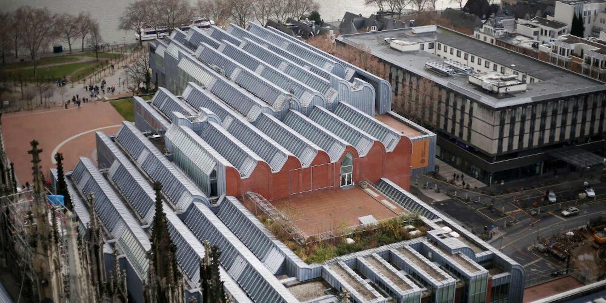 Das Museum Ludwig samt Philharmonie vom Dom fotografiert, links oben im Bild der Heinrich-Böll-Platz.