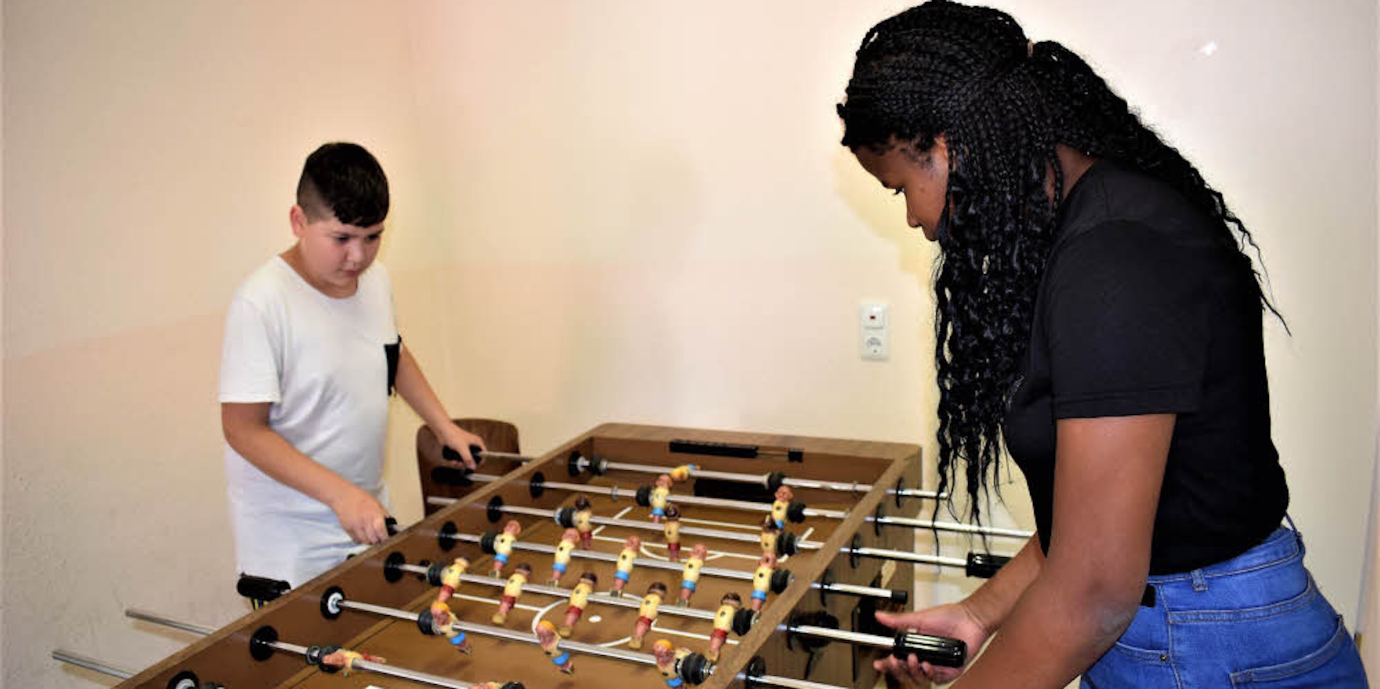 Onur und Josie (v.l.) wagten während der Eröffnungsfeier ein erstes Duell am Kicker.