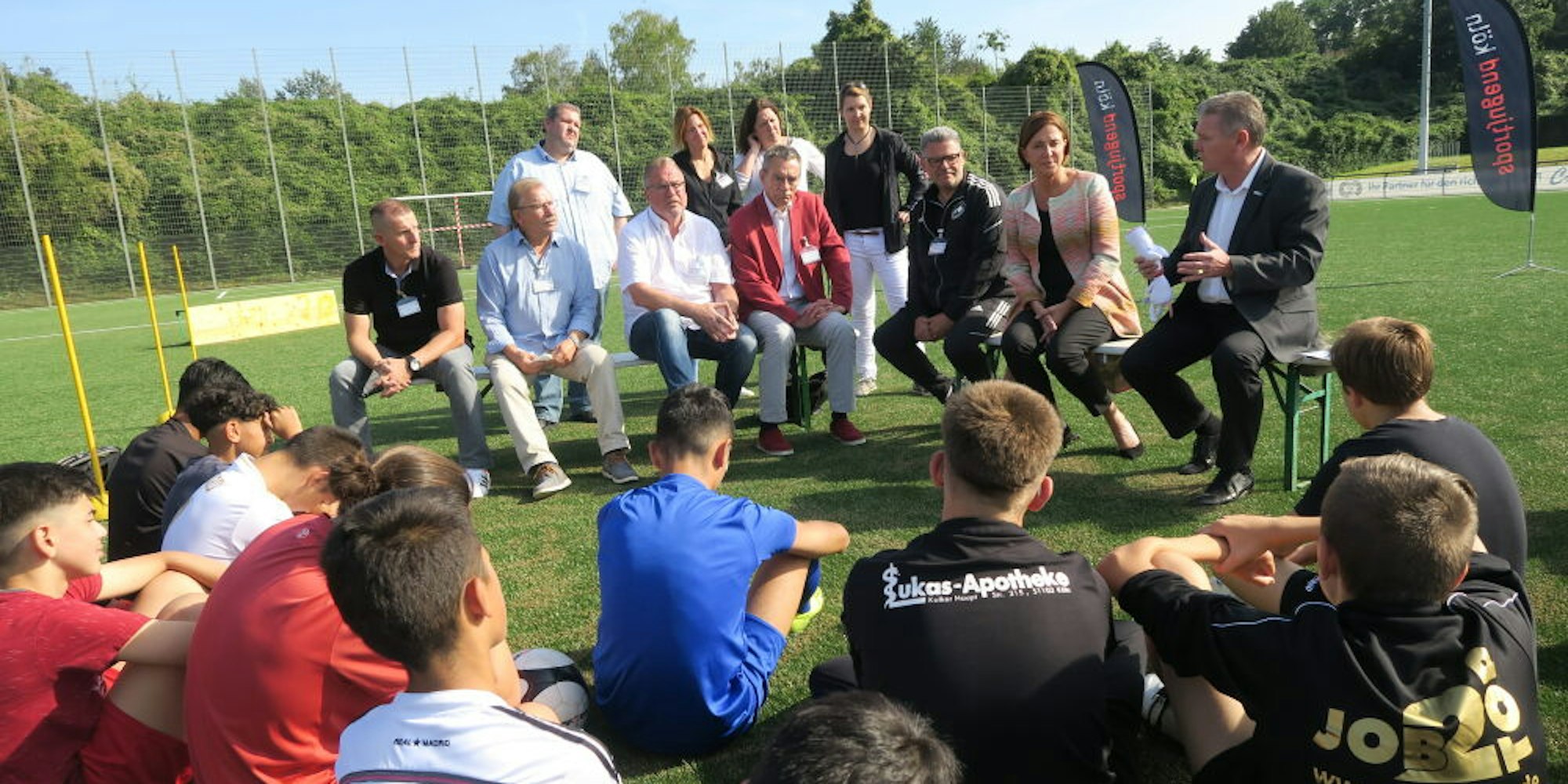 Ein positives Zeichen sei aber das große Interesse am „Extra-Zeit“-Programm: „Bis jetzt sind 2180 Anträge gestellt worden, wir hoffen, dass es bis zum Jahresende etwa 4000 sein werden“, so Klett. Denn nicht nur in den Ferien, auch an den Wochenenden und an unterrichtsfreien Nachmittagen können die Angebote laufen. „Für die Bearbeitung von Anträgen brauchen wir derzeit nur drei Tage“, ermutigt Martin Wonik vom Vorstand des Landessportbunds alle noch zögerlichen Vereine. Den Nutzen des Programms bestätigt Christian Olpen, Vorsitzender des SV Humboldt-Gremberg. Auf die kritische Nachfrage von Yvonne Gebauer, weshalb denn nur Jungs erschienen seien, antwortet Olpen: „Bis vor wenigen Jahren hatten wir noch 160 Mädchen im Verein. Aber wir arbeiten daran. Wenn Sie das nächste Mal kommen, präsentieren wir Ihnen auch eine Mädchenmannschaft.“