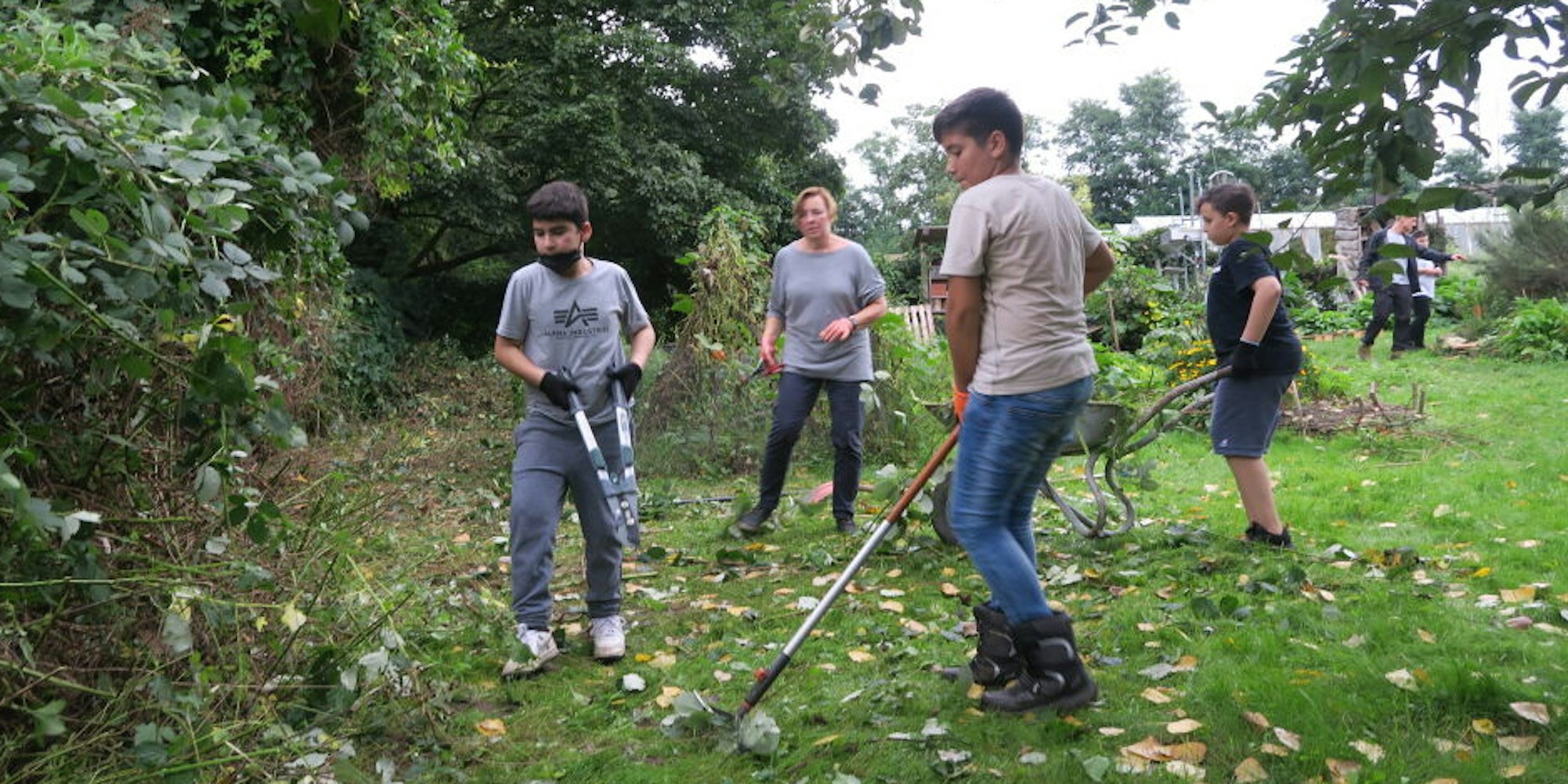 Köln-Vingst – Pflanzen sind wichtig und schützenswert, das lernt heute jedes Kind auf der Schule. Dennoch hacken Sven (12) und Luca (11) konzentriert und schon ein wenig atemlos auf das Grünzeug ein, die Wurzeln werden sorgfältig ausgegraben – und das unter den Augen ihrer Lehrer. Es handelt sich um Beinwell, ein krautiges Pflänzchen, das hier dicht und üppig wächst. „Wenn wir den nicht beseitigen, wuchert er bis in die Kürbisse rein, das ist nicht gut“, erklärt Sven und zeigt auf die kleine Kürbis-Plantage nebenan. „Da hinten steht noch mehr Beinwell, da müssen wir gleich noch ran“, sagt Luca.