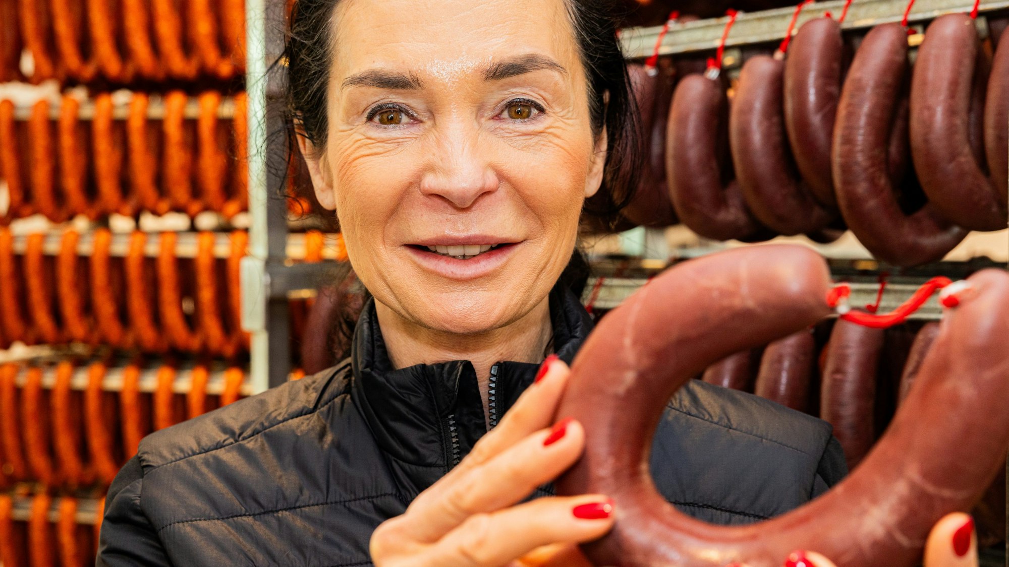 „Zum Karneval steigt die Produktion von Flönz um rund 50 Prozent an“, sagt die Geschäftsführerin. Der Arbeitstag von Astrid Schmitz beginnt mit einem liebgewonnenen Ritual. Auf ihrem Schreibtisch befinden sich zwei Ringe bester Flönz aus eigner Produktion. Qualitätskontrolle. „Oh ja, ich mag sie immer noch gern“, sagt die Geschäftsfrau und gönnt sich sogleich ein Scheibchen. Genau so, wie sie die Flönz am liebsten mag: Pur. Dabei musste die Liebe zwischen ihr und „de Woosch“ erst wachsen. 1911 nahm das Familienunternehmen Schmitz seinen Anfang. Der Großvater eröffnete in Heinsberg eine Metzgerei. Der Betrieb wurde von zweien der zehn Geschwister weiter geführt. Einer davon war der Vater von Astrid Schmitz. Ein Erfolgsrezept: Ein guter Draht zum Einzelhandel. In den 1990er Jahren ergab sich die Möglichkeit, einen Betrieb in Köln zu übernehmen. GS-Schmitz bekam seinen Stammsitz in der Domstadt. „Ich habe hier schnell gemerkt, wie stolz die Kölner auf ihre Bloodwoosch sind“, berichtet Astrid Schmitz. „Da habe ich mich intensiver mit diesem Produkt beschäftigt, es lieben gelernt.“