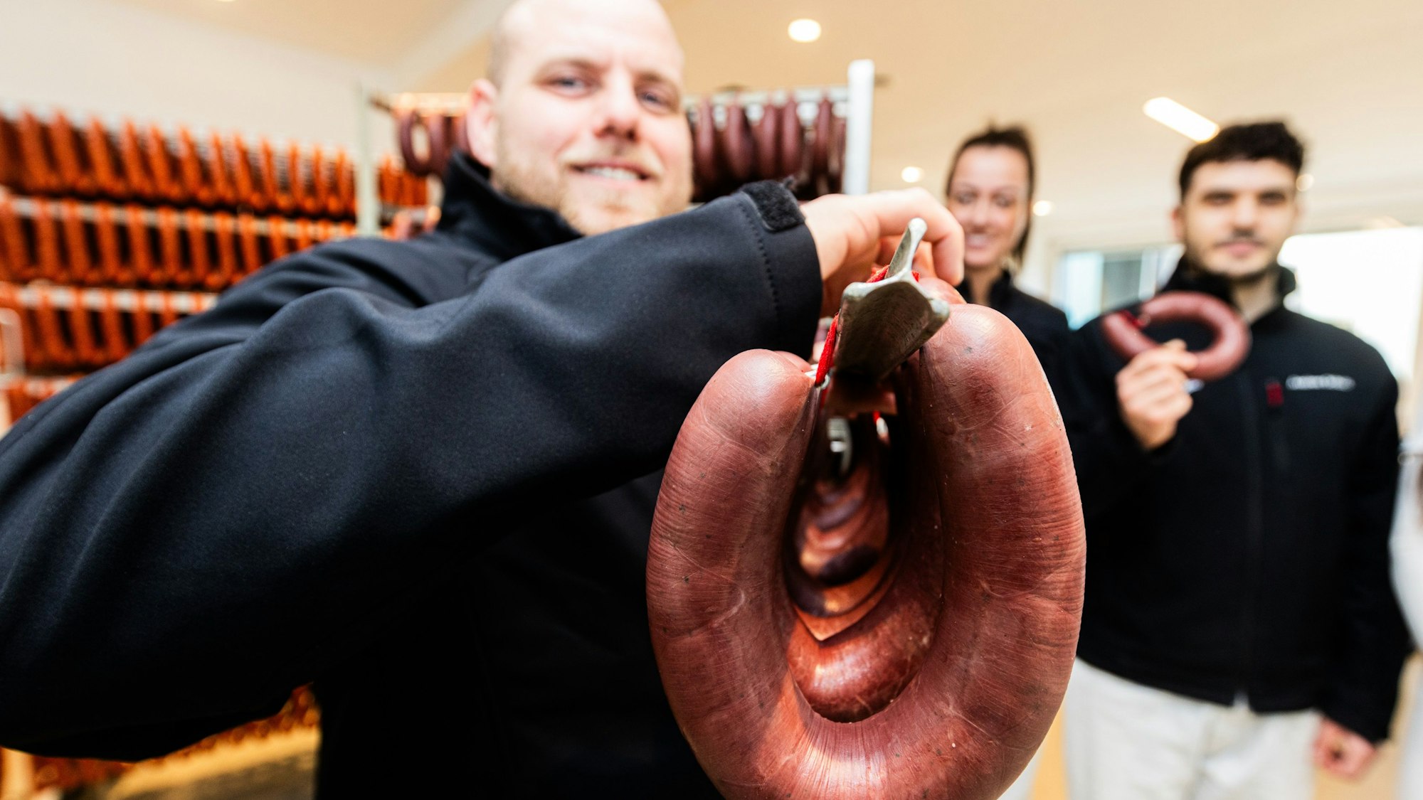 Bei der Wurst und Fleischunternehmen GS-Schmitz wird die Flönz mit viel Handarbeit und Liebe erzeugt.