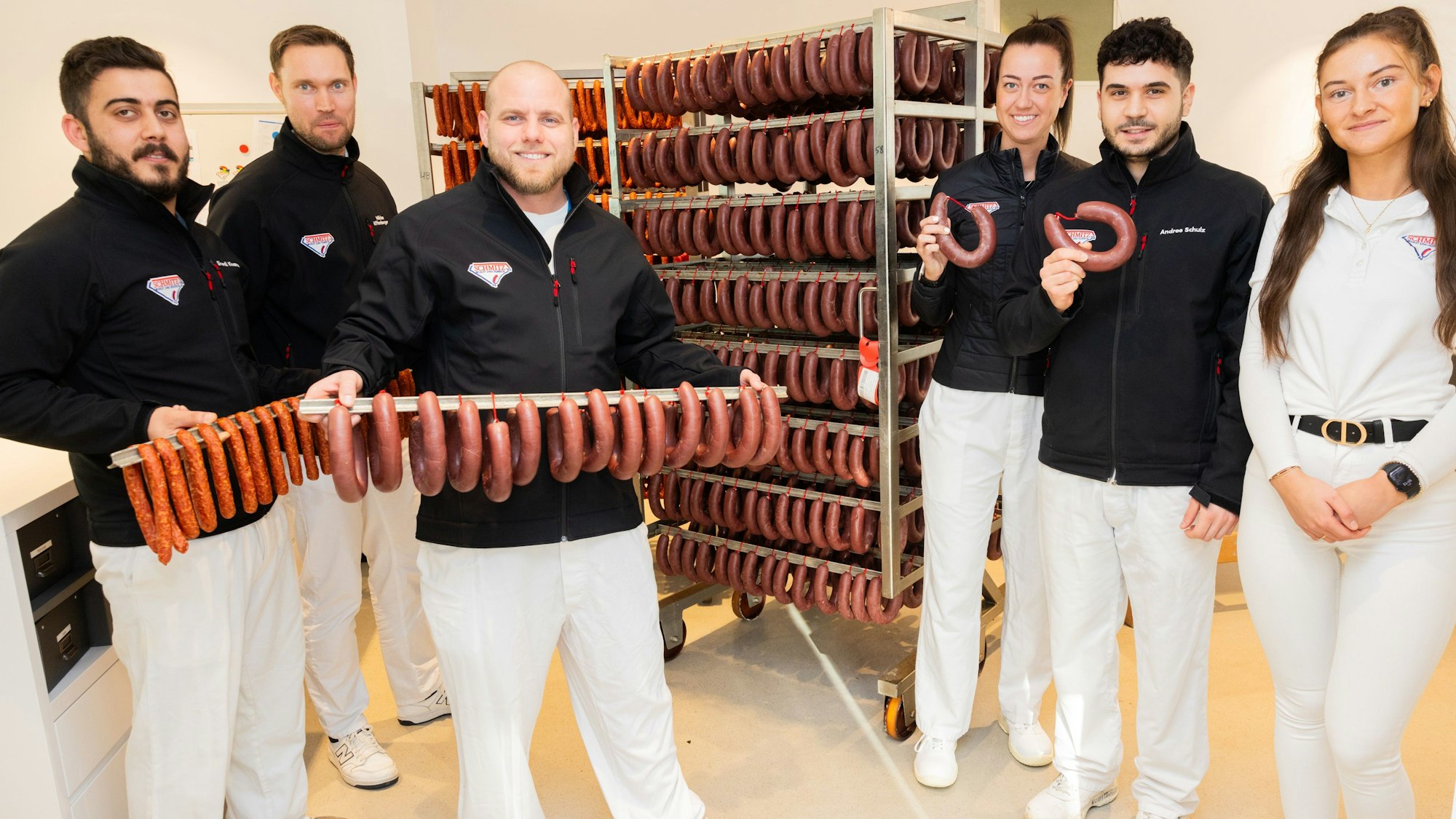 Im Kutter werden die Zutaten zerkleinert und vermengt. Die Masse wird in Rinderkranzdärmen verfüllt. Die Kränze kommen für den Kochvorgang in einen Kessel. Dann werden sie auf Stöcke gezogen und über Buchenholz geräuchert. 300-Gramm- und 400-Gramm-Ringe entstehen so. Verpackt vor Ort. Um 2 Uhr morgens gehen bei GS-Schmitz im Kölner Norden die Lichter an. Um 24 Uhr gehen sie wieder aus. Dazwischen wird in drei Schichten viel Handarbeit geleistet. Rund zwei Drittel der 180 Mitarbeiterinnen und Mitarbeiter sind Metzger. Und worauf Astrid Schmitz besonders stolz ist: Erst kürzlich konnte sie wichtige Positionen in ihrem Betrieb mit eigenen Kräften um die 30 Jahre besetzten. Ob aus Deutschland, Syrien, der Türkei: beruflich groß geworden sind sie bei GS-Schmitz. „Frisches Blut für die Blutwurst, sozusagen“, lacht die Chefin.