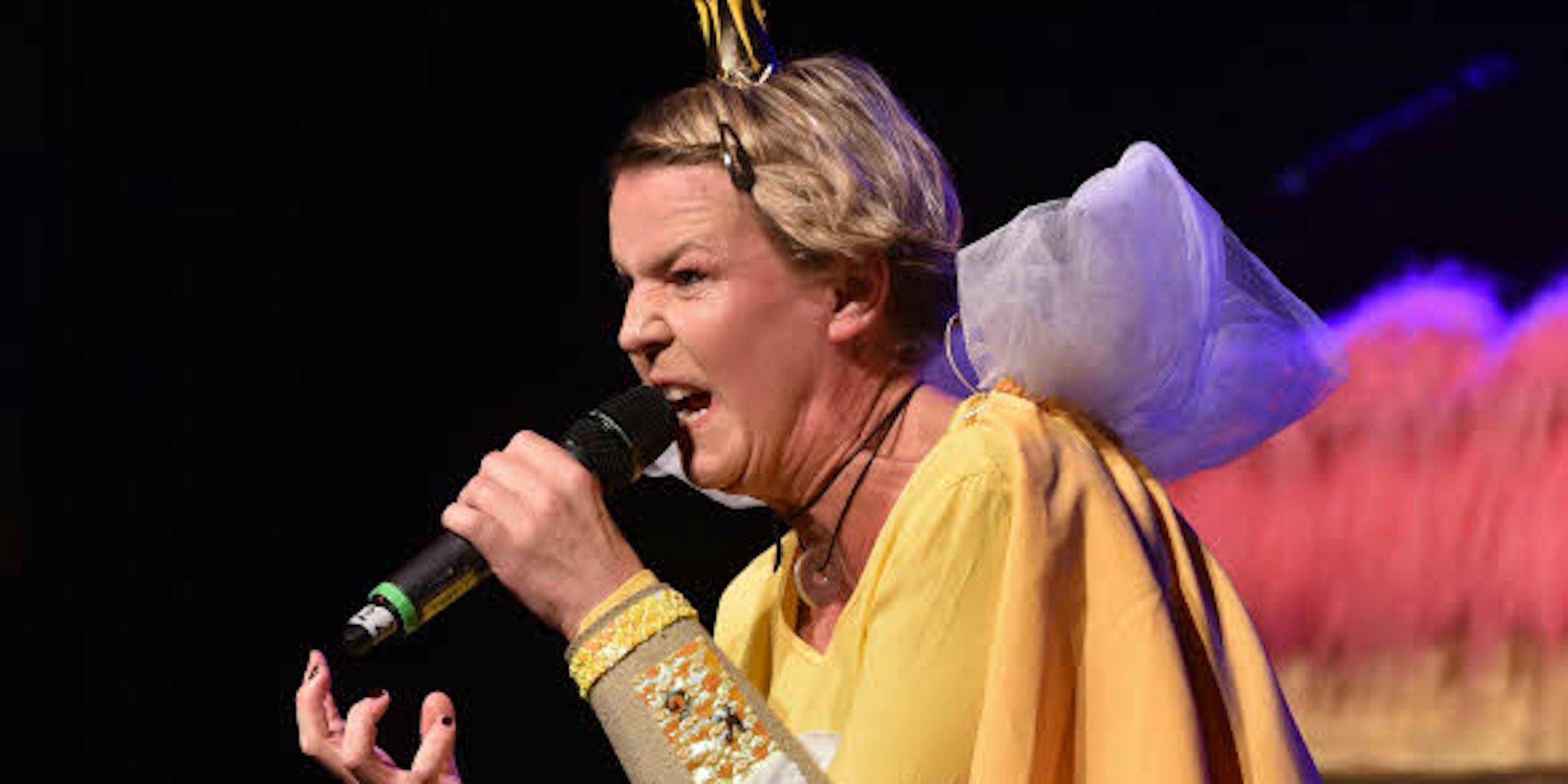 Als Kölschgirl verzapft Präsidentin Mirja Boes ihre Witze in der alternativen Karnevalsrevue. Präsentiert wird in der Premiere oft fade Fastelovends-Kost, garniert mit Moderations-Zuckerguss von Boes und Kollege Olaf Bürger.