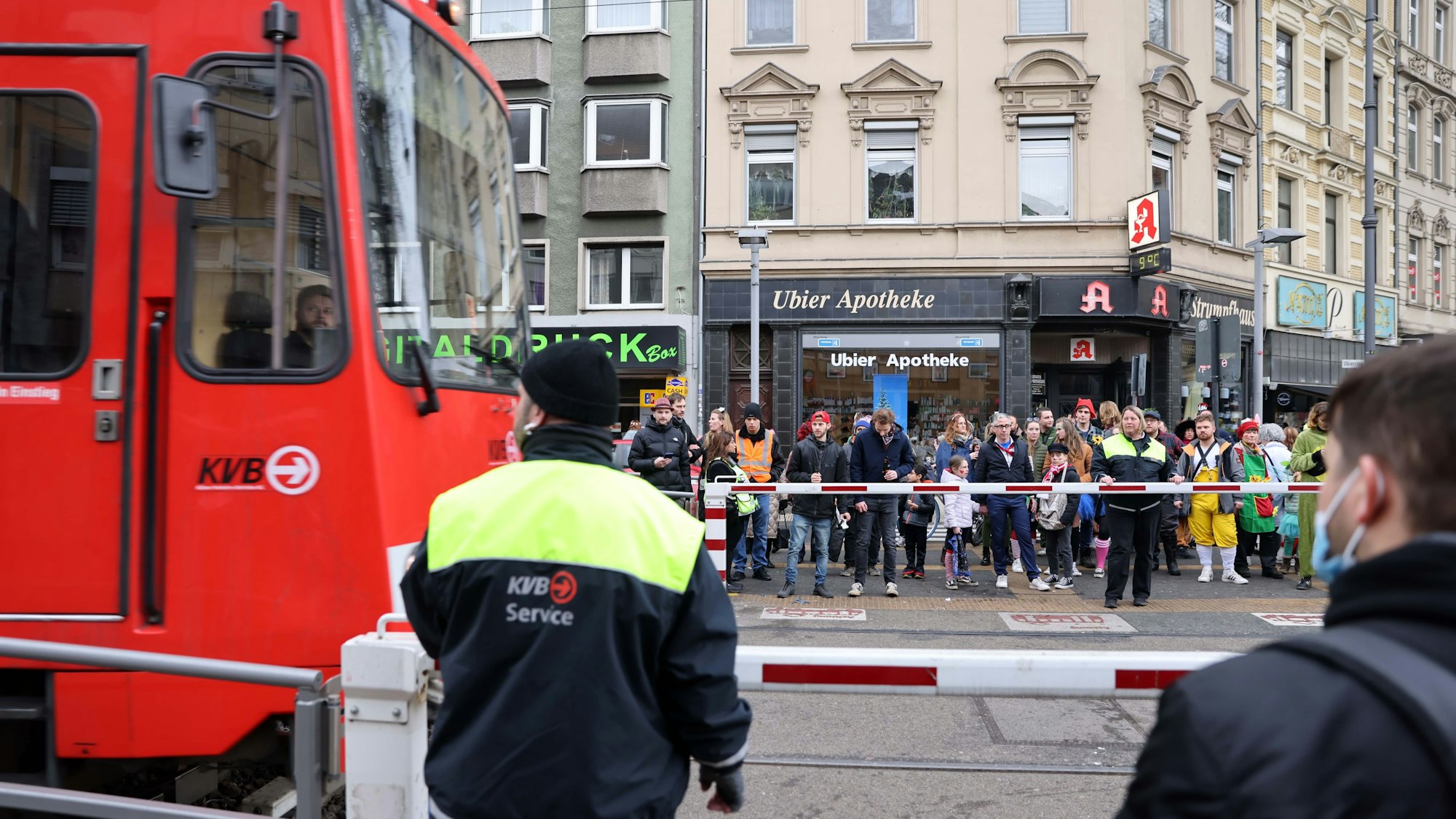 Während der Karnevalstage treffen die KVB besondere Vorsichtsmaßnahmen an manchen Übergängen, wie hier am Chlodwigplatz.