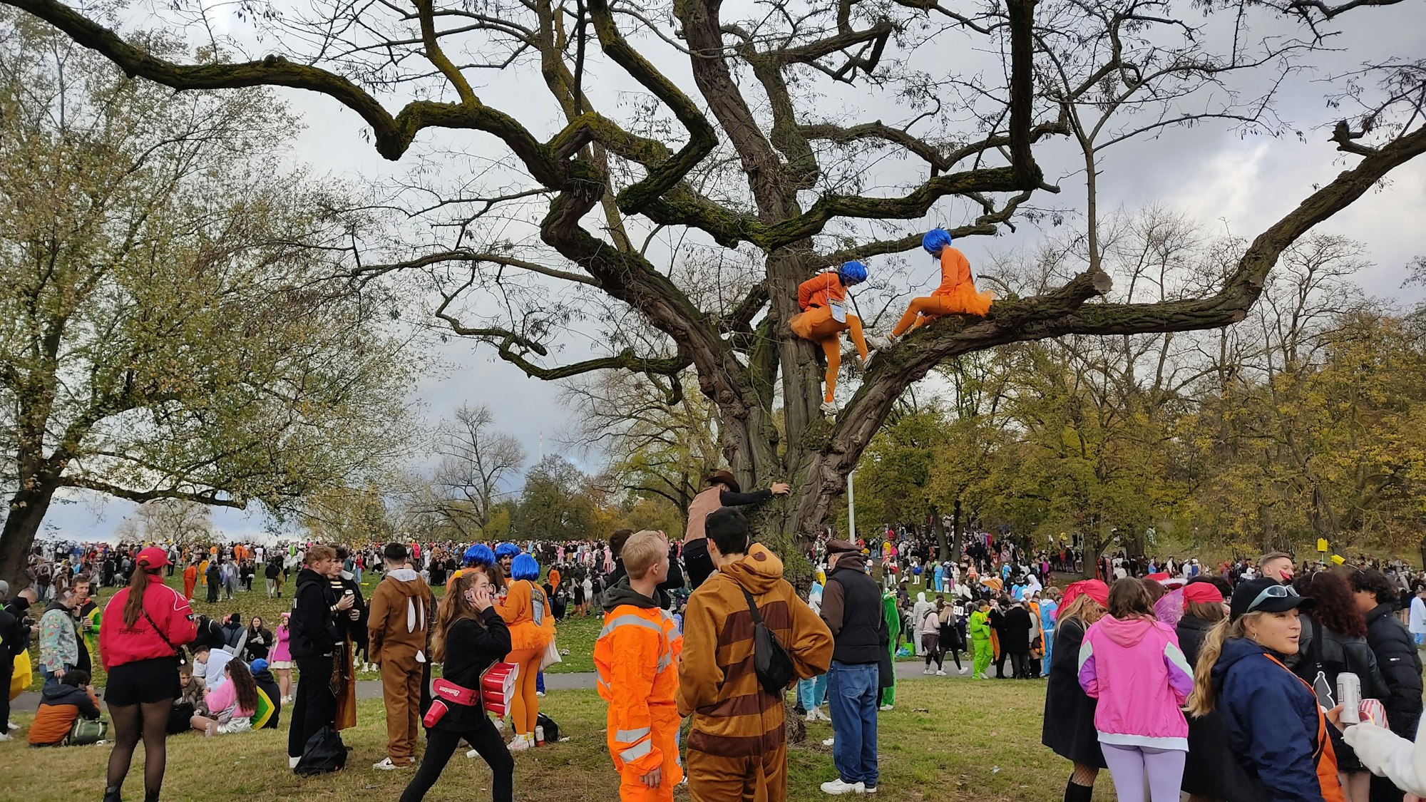 33.000 Quadratmeter ist die Fläche auf der Uniwiese groß, die die Zülpicher Straße entlasten soll. 15.000 Menschen sollen dort Platz haben, wie viele es aktuell sind, ist schwer zu sagen. Die Fläche wird jedenfalls immer voller. „Eigentlich wollte wir auf die Zülpicher, aber wir wurden nicht mehr reingelassen“, sagt eine junge Dinosaurier-Frau. „Jetzt ist es aber auch hier super. Mit so vielen Menschen auf einem Fleck zu feiern, macht einfach Spaß.“ Eine Gruppe mit 80er-Disco-Outfits sieht das anders. Einer sagt: „Ich schwöre, sonst war es entspannter hier. Das sind einfach zu viele Menschen.“
