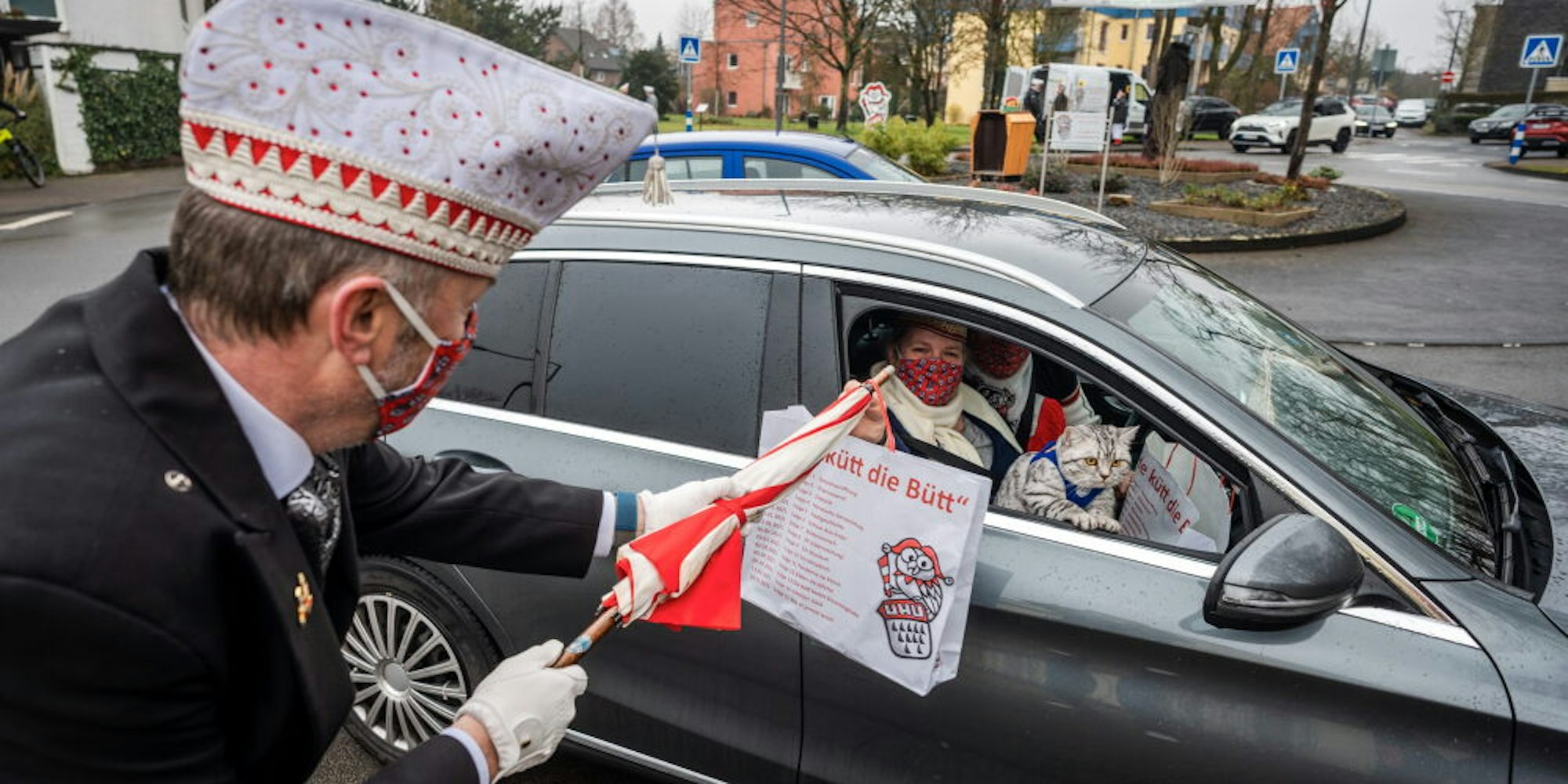 Karnevals-Corso: Am Regenschirm reicht der Vorstand der KG Uhu seinen Mitgliedern den Sessions-Beutel in die Autos, diese beiden Karnevalisten haben sogar ihre Katze mitgebracht.