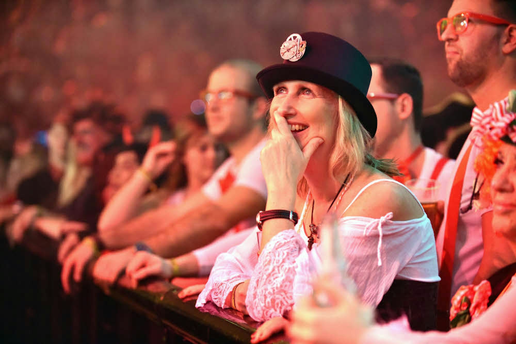 Die Nachwuchsband kommt aber nicht nur bei jungen Karnevalsfans und Studenten an. Eine Besucherin aus Niederkassel kommt schon seit Jahren zur Lachenden Kölnarena. „Ich bin zwar schon 50 Jahre alt, aber traditionelle Sitzungen waren nie meins. Ich finde es toll, dass hier die ganzen jungen Bands sind und es viel mehr Musik als Reden gibt“, erklärt sie. Auch eine andere Besucherin, die mit einer Gruppe von Gartenzwergen angereist ist, ist begeistert von dem Programm. „Die Stimmung ist einzigartig. Hier kann man einfach einen Abend lang zu Brings, Cat Ballou und allen anderen schunkeln, singen und tanzen.“ Kritik gab es nur im hinteren Teil des Innenraums: Dort war die Akustik nicht so gut, was die Jecken besonders während der Redebeiträge störte. Marc Metzgers Auftritt oder Bernd Stelters Jahresrückblick sorgten zwischen den Bands trotzdem für viele Lacher. Im Mittelpunkt der Witze: Brexit, Trump und Erdoğan. Applaus und Standing Ovations erntete Metzger mit der zum Sessionsmotto passenden Aufforderung, die Welt trotz aller Schwierigkeiten öfter mal durch die Augen von Kindern zu sehen, die die Hautfarbe nicht interessiert.