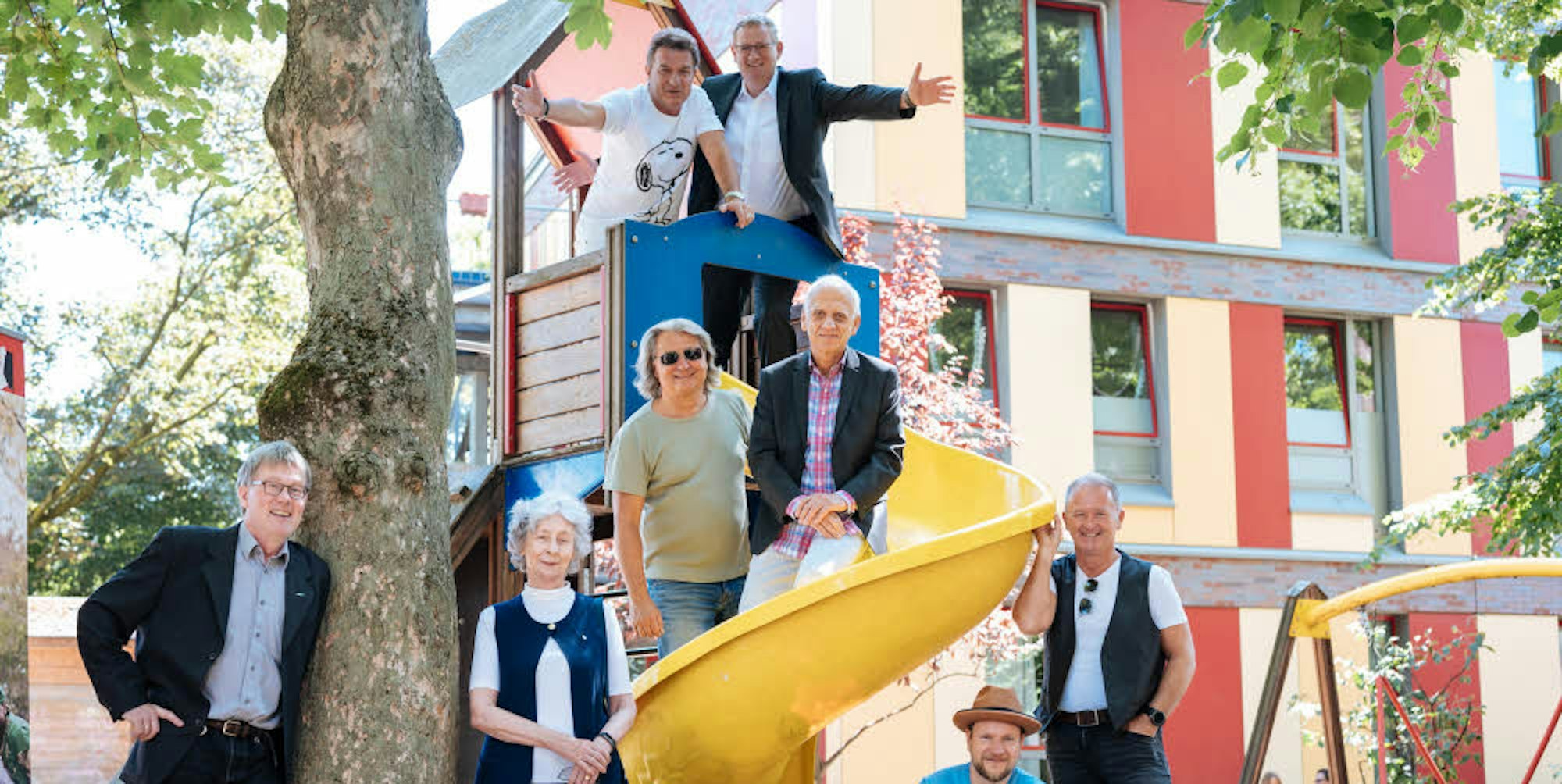 Die Grosse von 1823 mit Präsident Prof. Joachim Zöller (3.v.r.) unterstützt „wir helfen“ mit der Vorsitzenden Hedwig Neven DuMont (2.v.l.). über Spenden freut sich Johannes Krane-Erdmann (l.) von der Villa Kunterbunt. Dafür verzichten die Musiker der Bands auf ihre Gage.
