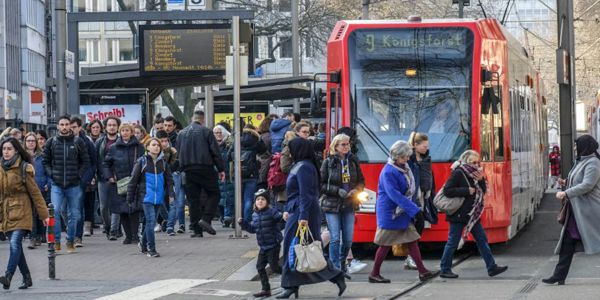 Volle Bahnen und überfüllte Bahnsteige: Auch auf der Linie 9 will die KVB mit Langzügen die Kapazitäten steigern. Der Rat der Stadt soll nun grünes Licht für die Investition geben.