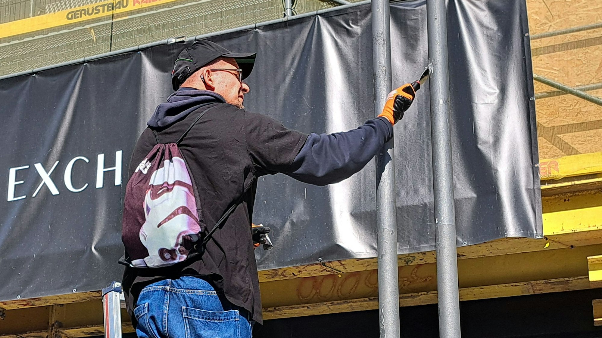 Ein Teilnehmer steht auf der Leiter und entfernt Aufkleber an einem Laternenpfahl.
