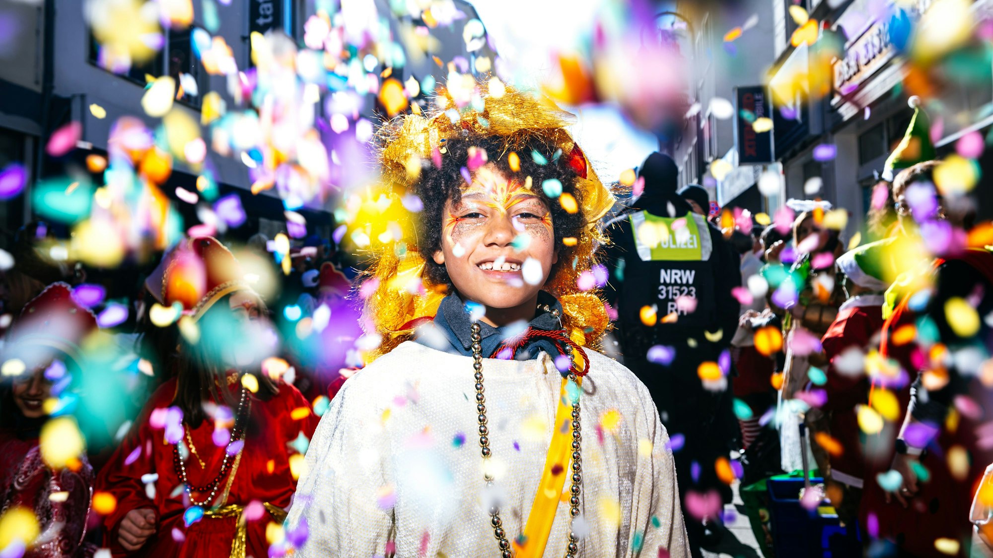 Künstliche Intelligenz hat das Erich-Kästner-Gymnasium als Motto gewählt. Die Schülerinnen und Schüler tragen Fragen auf dem Kopf, die KI beantworten können soll. Eine lautet: „Kann die AfD in einem schwarzen Loch verschwinden?“ Eine ganze Handvoll Schulen feiert 2025 Jubiläum – und thematisiert das auch gleich im Zug. Kölns ältestes Gymnasium, das Dreikönigs-Gymnasium, kommt zum stolzen 575-jährigen-Bestehen mit goldenen Umhängen und Kappen. Das Friedrich-Wilhelm-Gymnasium greift zum 200-Jährigen den Ikarus-Mythos auf − verkleidet als prächtige und phantasievolle Flügelgestalten. 125 Jahre feiert die Katholische Grundschule Zugweg mit Zylindern und roten Schleifen, während das Gymnasium Rodenkirchen zum 60-Jährige die Teilnehmer in Tortenstücke gesteckt hat. Richtig viel Kopfarbeit zeigt das Heinrich-Mann-Gymnasium – mit goldenen Perücken-Ungetümen aus Schaumstoff.